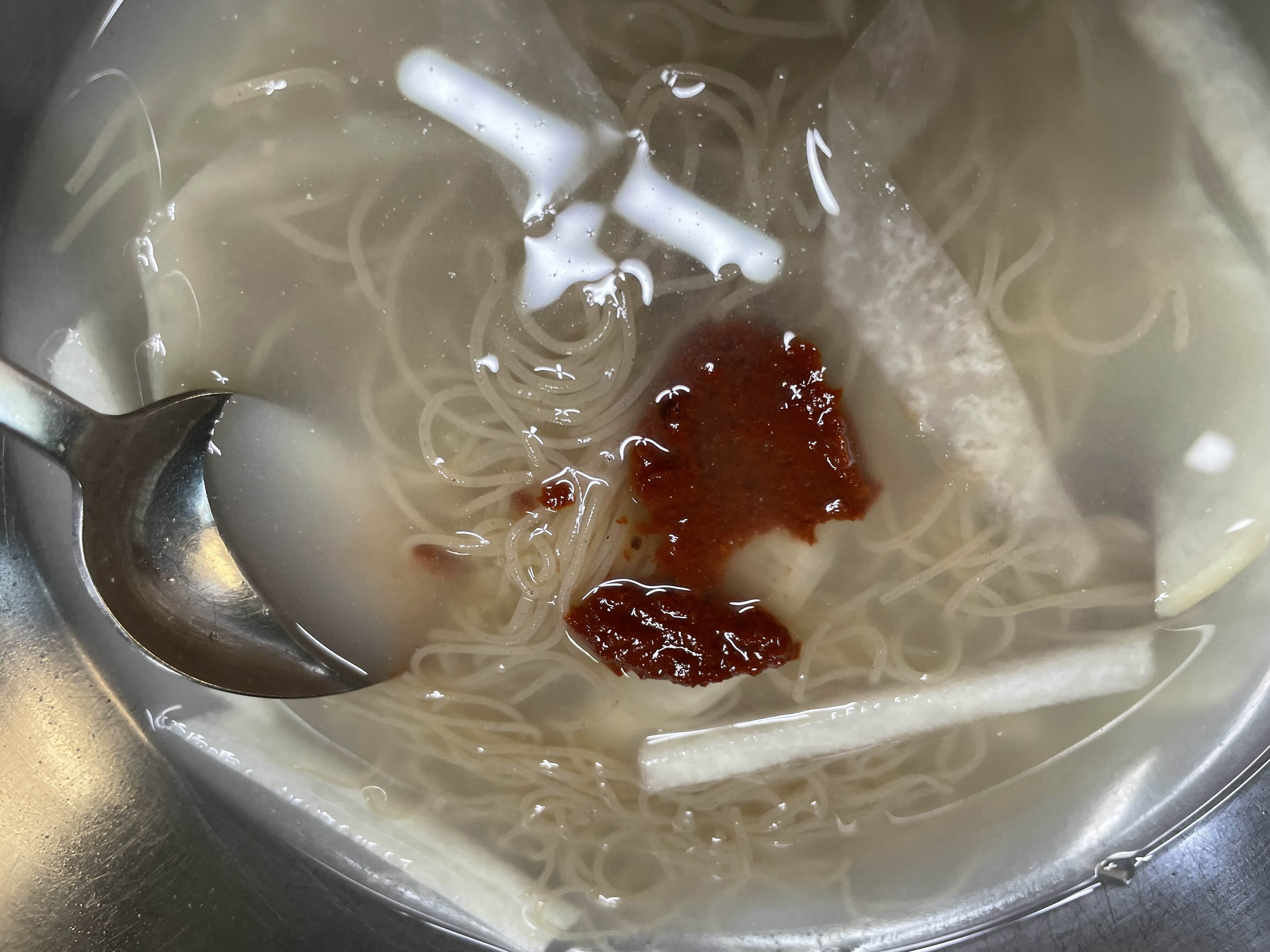 마지막은 다대기와 함께합니다. 이런저런 양념을 해가며 먹다가 마지막에는 다대기를 섞었습니다. 이건 저도 처음한 경험이었는데 다음에 간다면 다대기는 넣지 않을 것 같습니다. 고춧가루 정도 살짝 뿌려 먹는다면 충분할 것 같습니다. 다대기를 같이 주시길래 넣어 먹어봤는데 제 취향은 아니었습니다. 저는 식초와 겨자, 고춧가루 까지입니다.