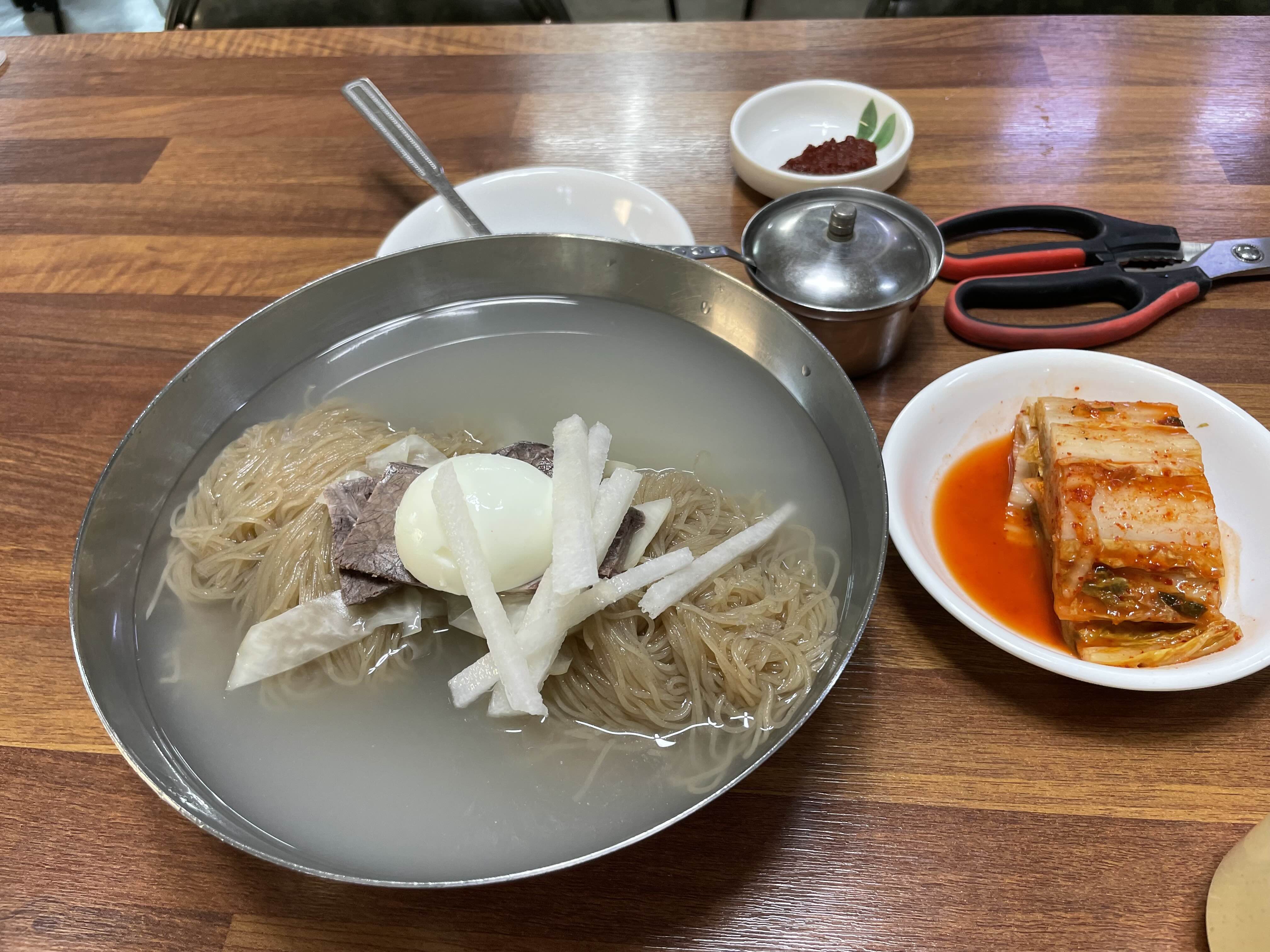 배와 수육, 계락이 올라가 있습니다. 여느 평양냉면집에서 보는 것과 같지만 국물이 허여멀겋습니다. 슴슴하다 심심하다는 맛을 느끼려면 이곳의 평양냉면을 먹어봐야합니다. 냉반이라고 밥을 말아 주시도 하신다는데 저는 면을 좋아하기 때문에 냉면을 먹었습니다. 사실 이런 심심한 국물에 밥을 말아 먹는 다는 것이 잘 상상도 안되기도 합니다.