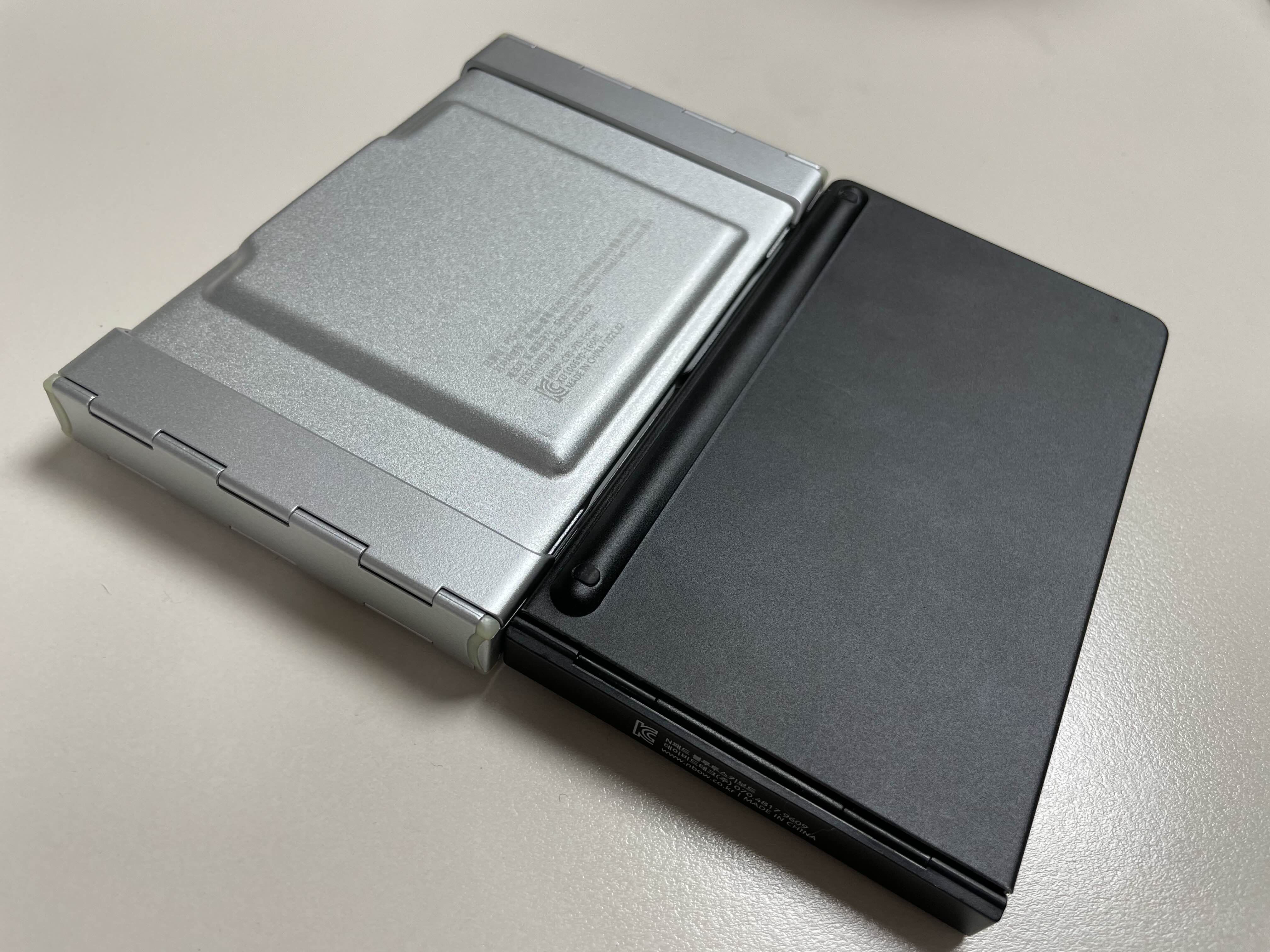 그동안 제가 써오던 N패드와 비교입니다. 넓이는 N패드가 더 넓습니다. 그도 그럴 것이 경첩부분이 접히게 다르다 보니 경첩 크기만큼 차이가 납니다. 접었을 때 크기는 아래도 보시겠지만 같습니다.