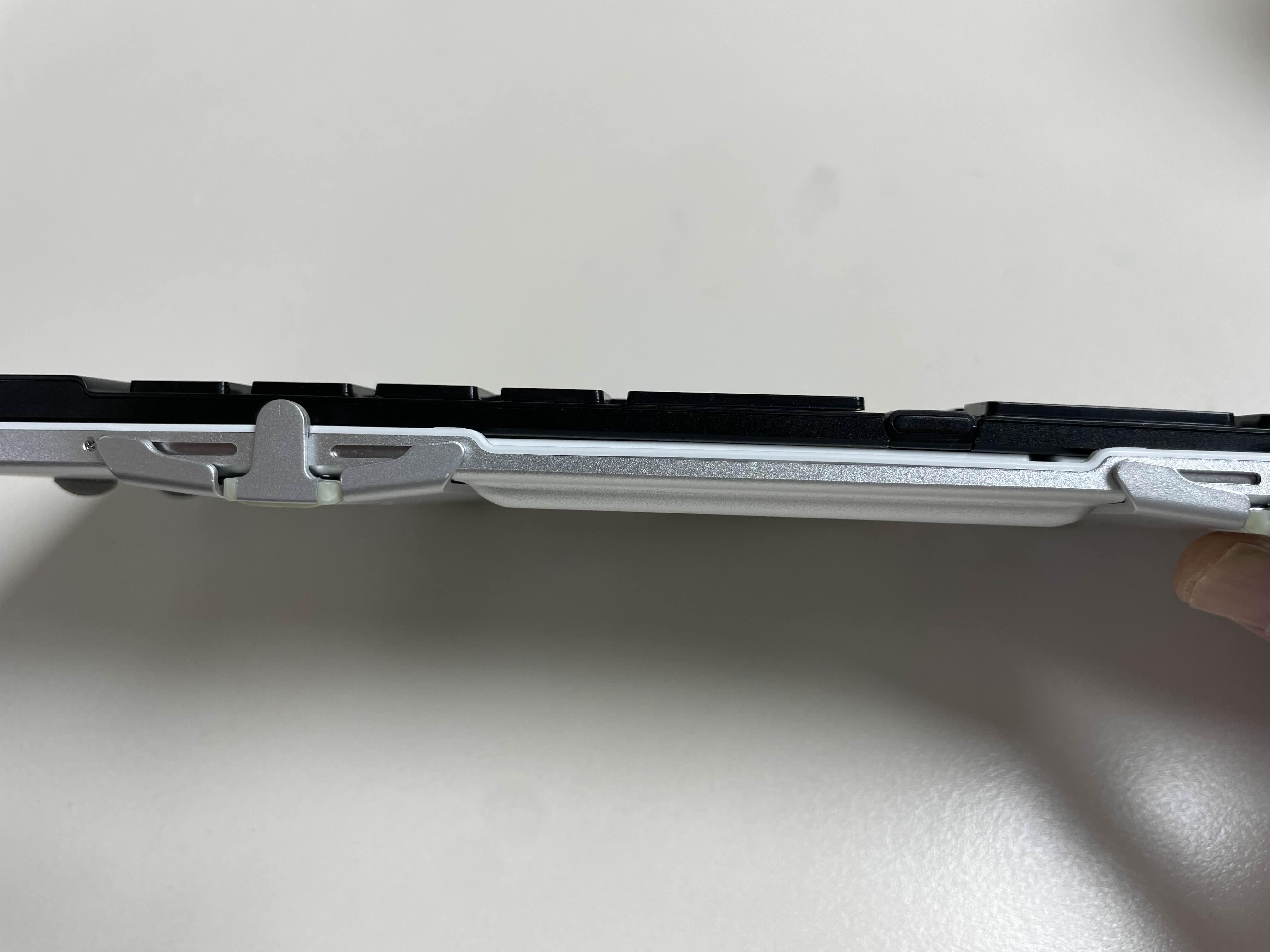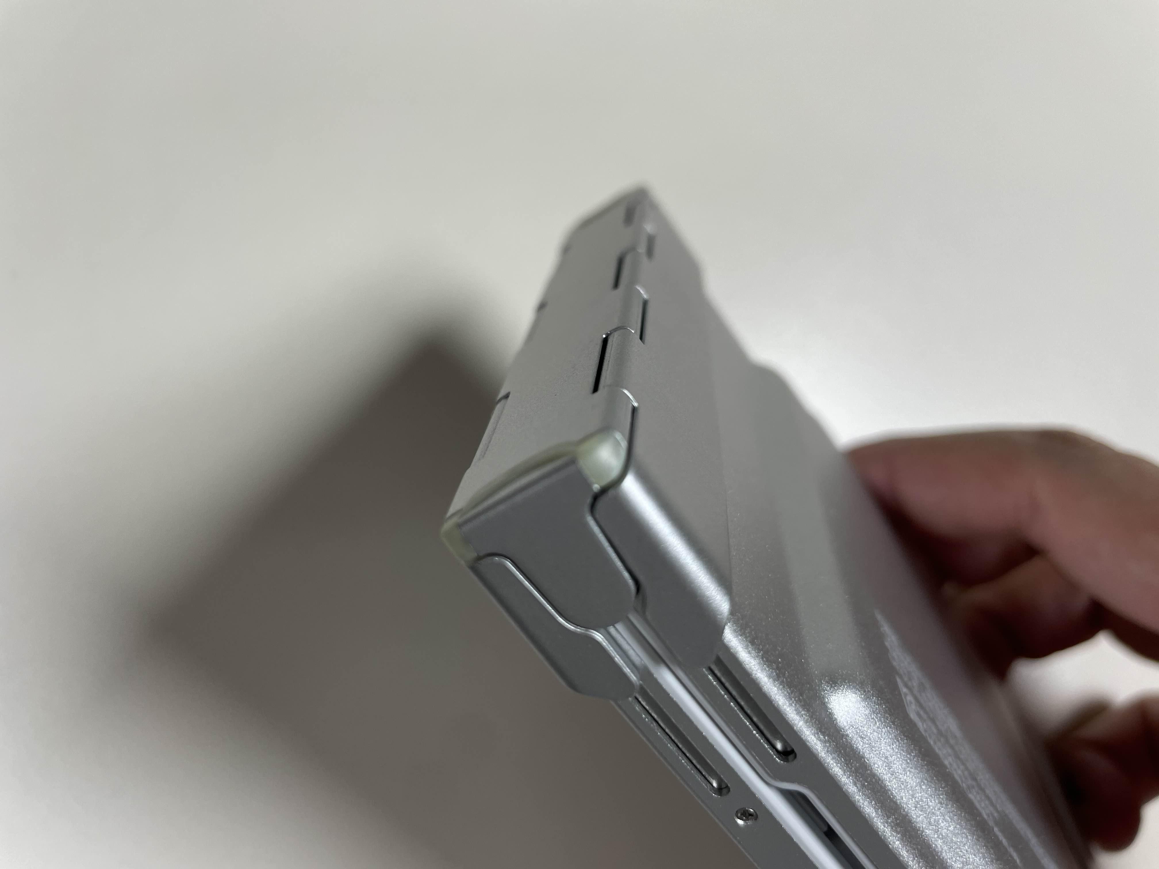 폈을 때 위 아래로 톡 튀어나와 보이는 내부 경첩도 실제로 사용할 때는 전혀 거슬리지 않습니다. 사진을 찍으니 엄청 거슬려 보이네요. 사진으로만 봐도 크기가 상당히 작은 것을 알 수 있습니다. 처음 쓸때는 약간 적응기를 거쳐야하지만 보통 남자손 크기인 제가 사용하기에 크게 불편하지는 않았습니다.