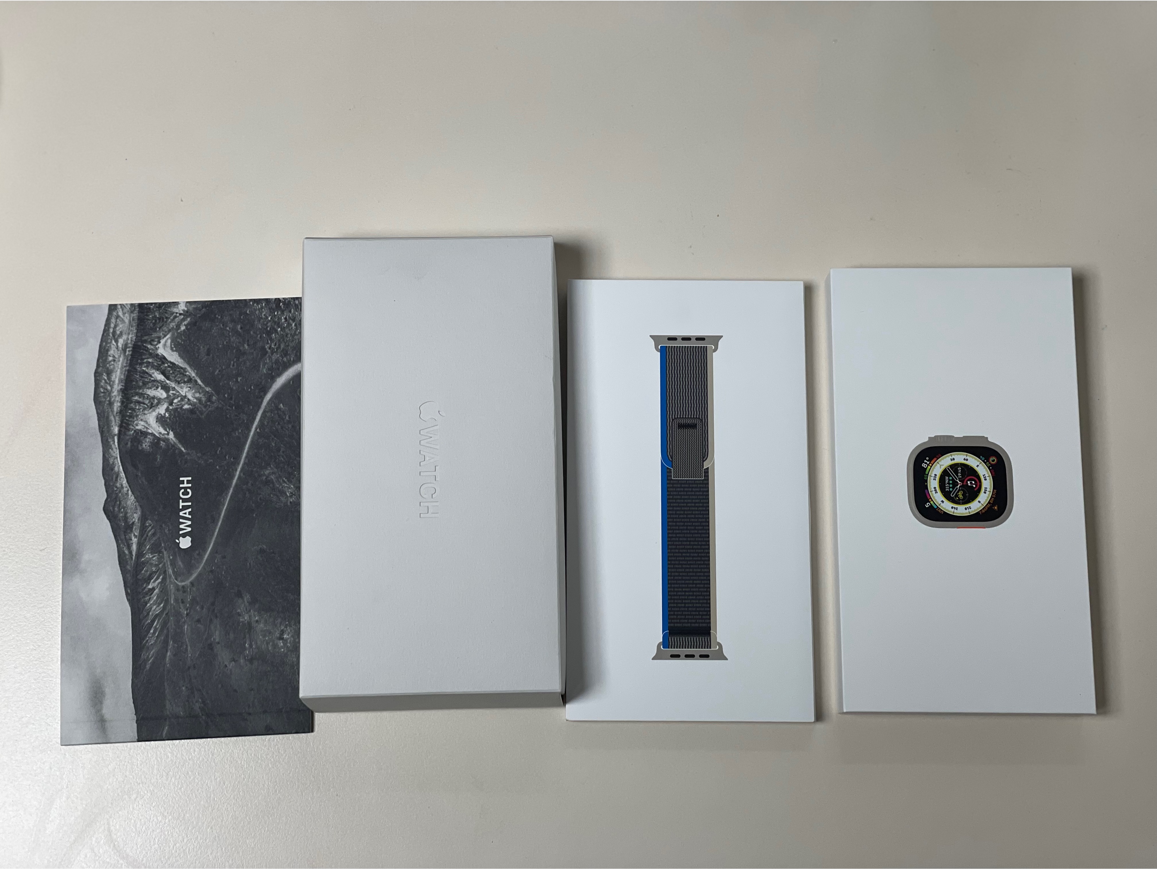 내용물은 아래와 같이 있습니다. 사실 애플워치울트라의 시그니쳐 밴드는 알파인 밴드입니다. 그리고 그게 제일 멋있죠. 하지만 저는 경제적 부담으로 트레일 루프가 들어있는 시계를 샀습니다. 어차피 시계만 같으면 됩니다. 어차피 애플워치라면 SE를 사지 왜 울트라를 샀을까하는 후회가 벌써부터 들기 시작하지만 이미 샀습니다.