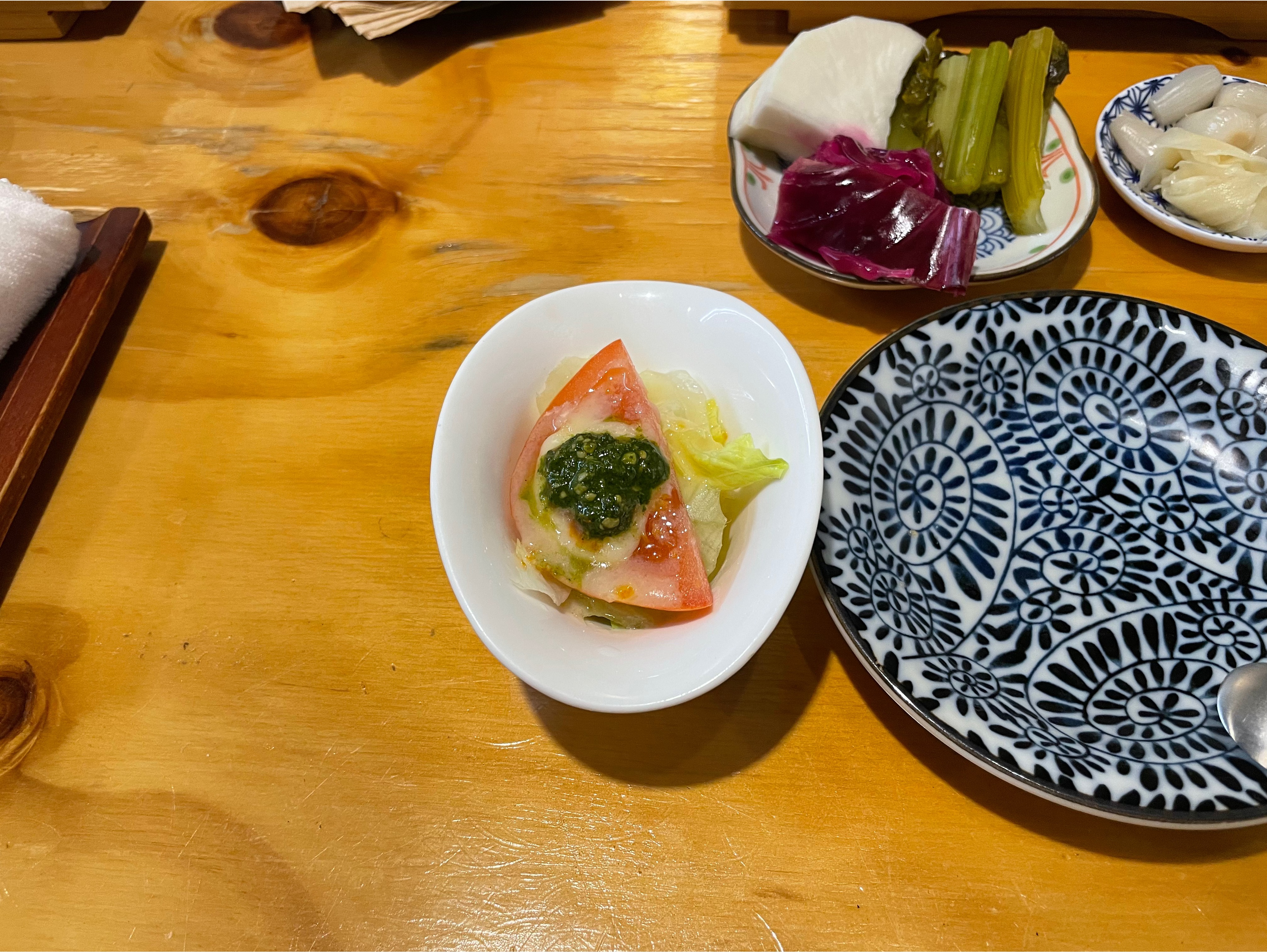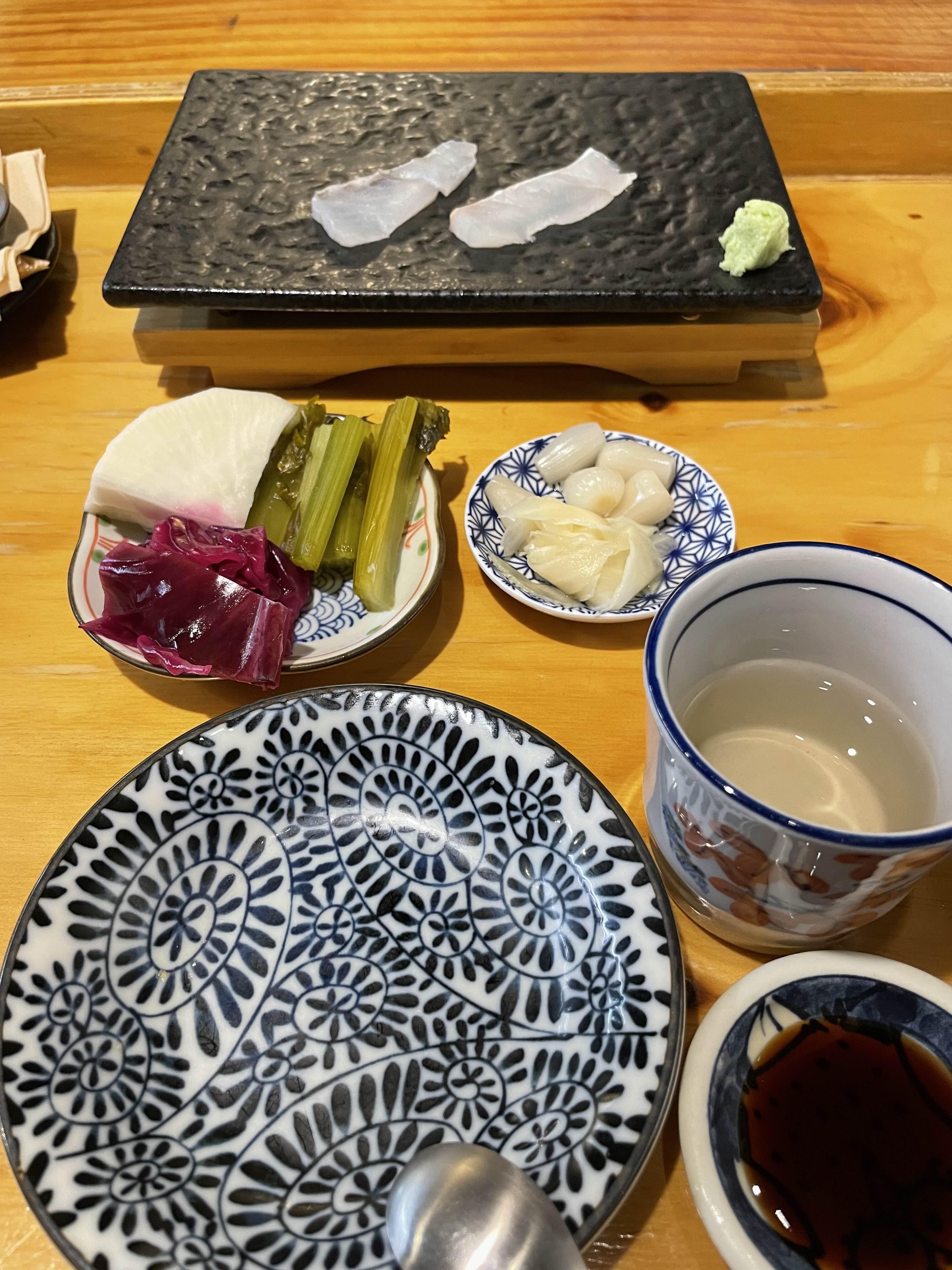 기본 상차림입니다. 스시집에 늘 나오는 절임이 있습니다. 특이한게 통무 절임이랑 붉은 양배추그리고 샐러리인지 갓인지 모를 절임이 같이 나옵니다. 중간 중간 하나씩 먹으면 입맛을 깔끔하게 정리해줍니다. 가장 처음으로 사시미를 줍니다. 광어와 농어입니다.