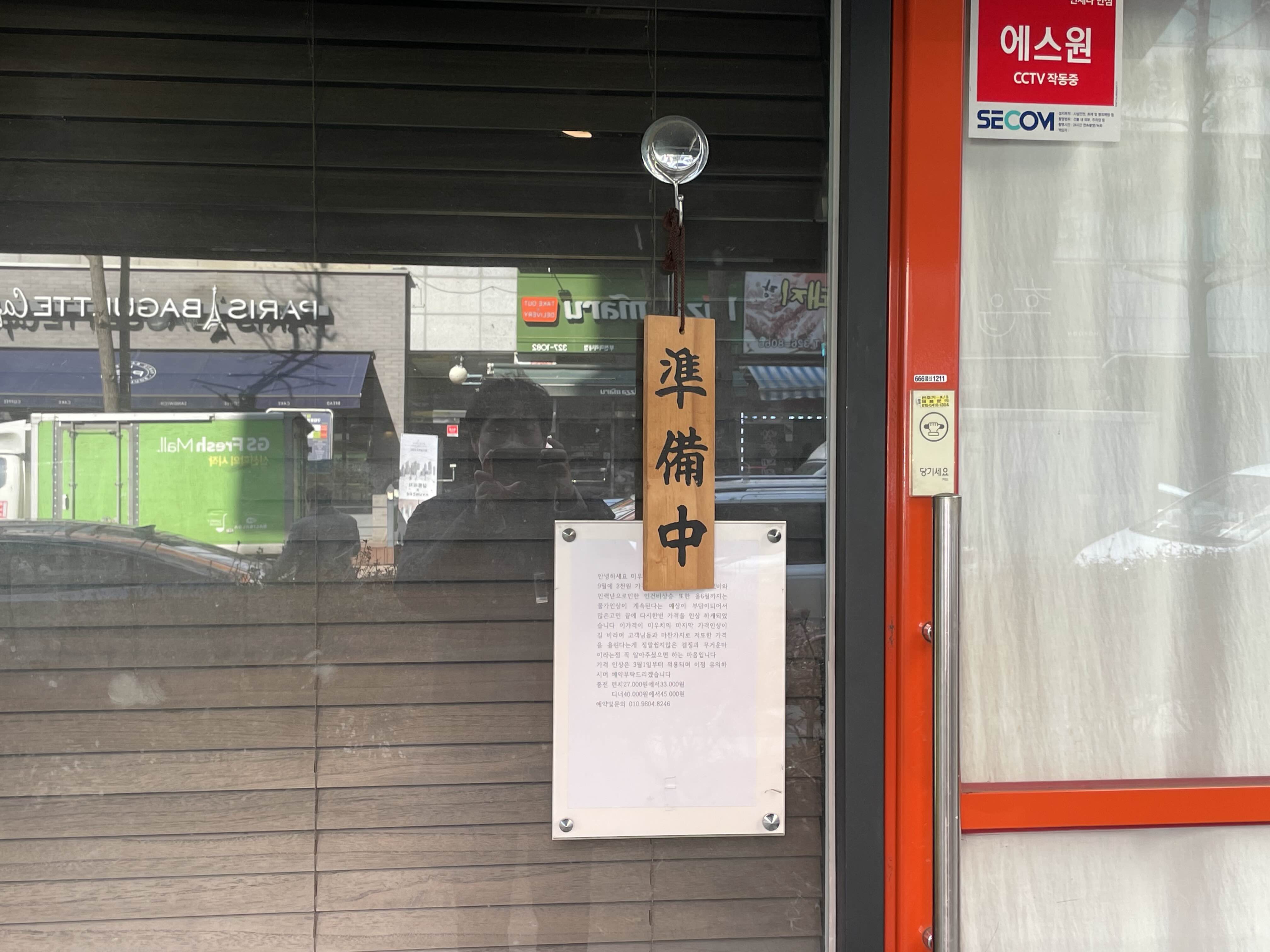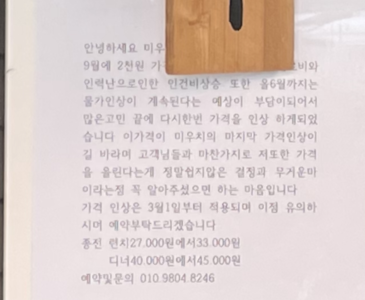 준비중 명판을 보니 밑에는 뭔가 달려있습니다. 자세히 보니 금액 인상입니다. 3월부터는 런치 3만 3천원, 디더 4만 5천원입니다. 오른 가격도 굉장히 합리적입니다. 오마카세를 이 가격에 먹기는 쉽지 않죠.