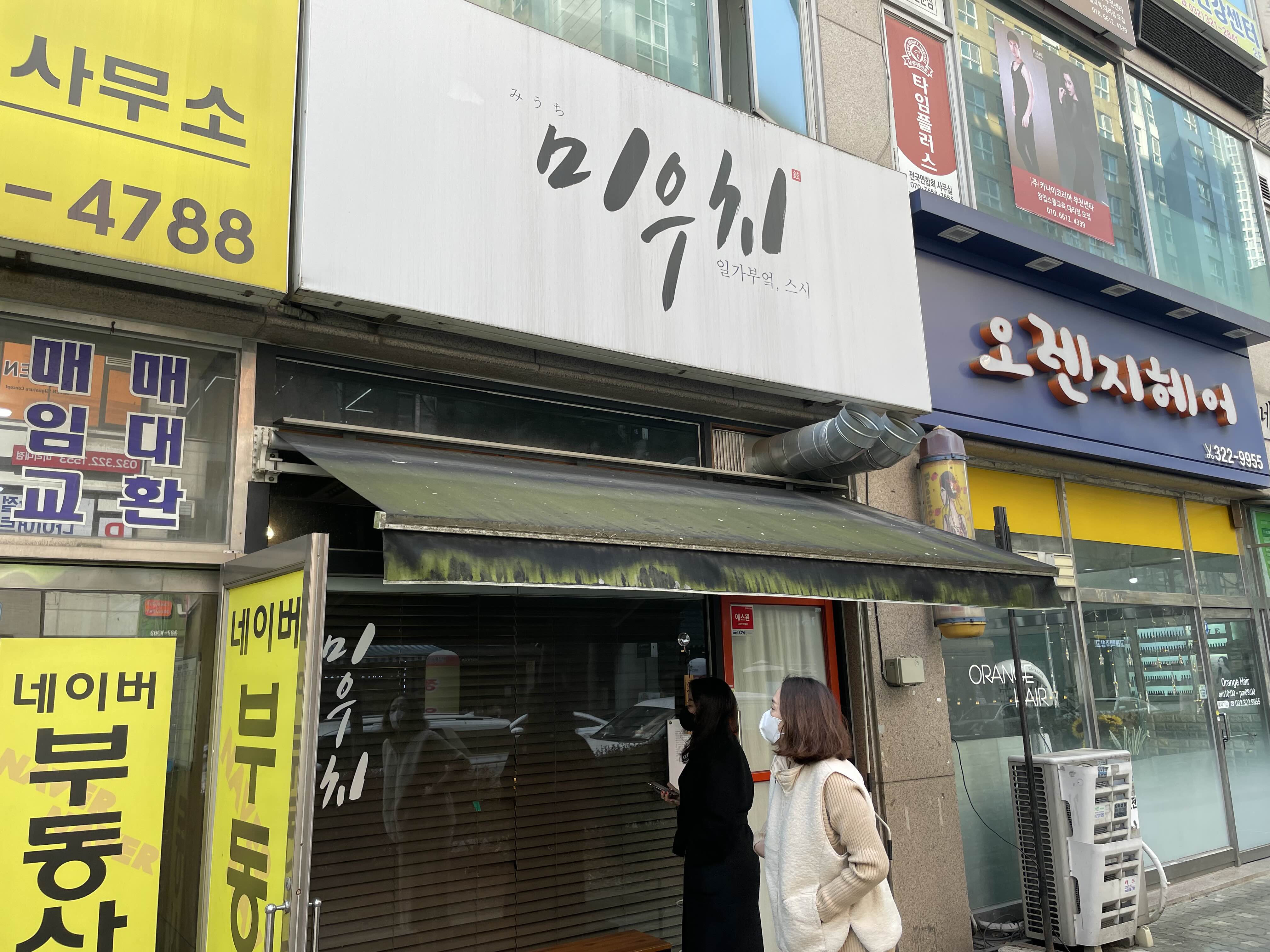 미우치는 부천 신중동역 가까이 위치해 있습니다. 상가들로 빼곡한 곳 사이에 아담한 가게가 있어요. 예약제로 운영되고 있으며 점심은 1시간, 저녁은 2시간입니다.
