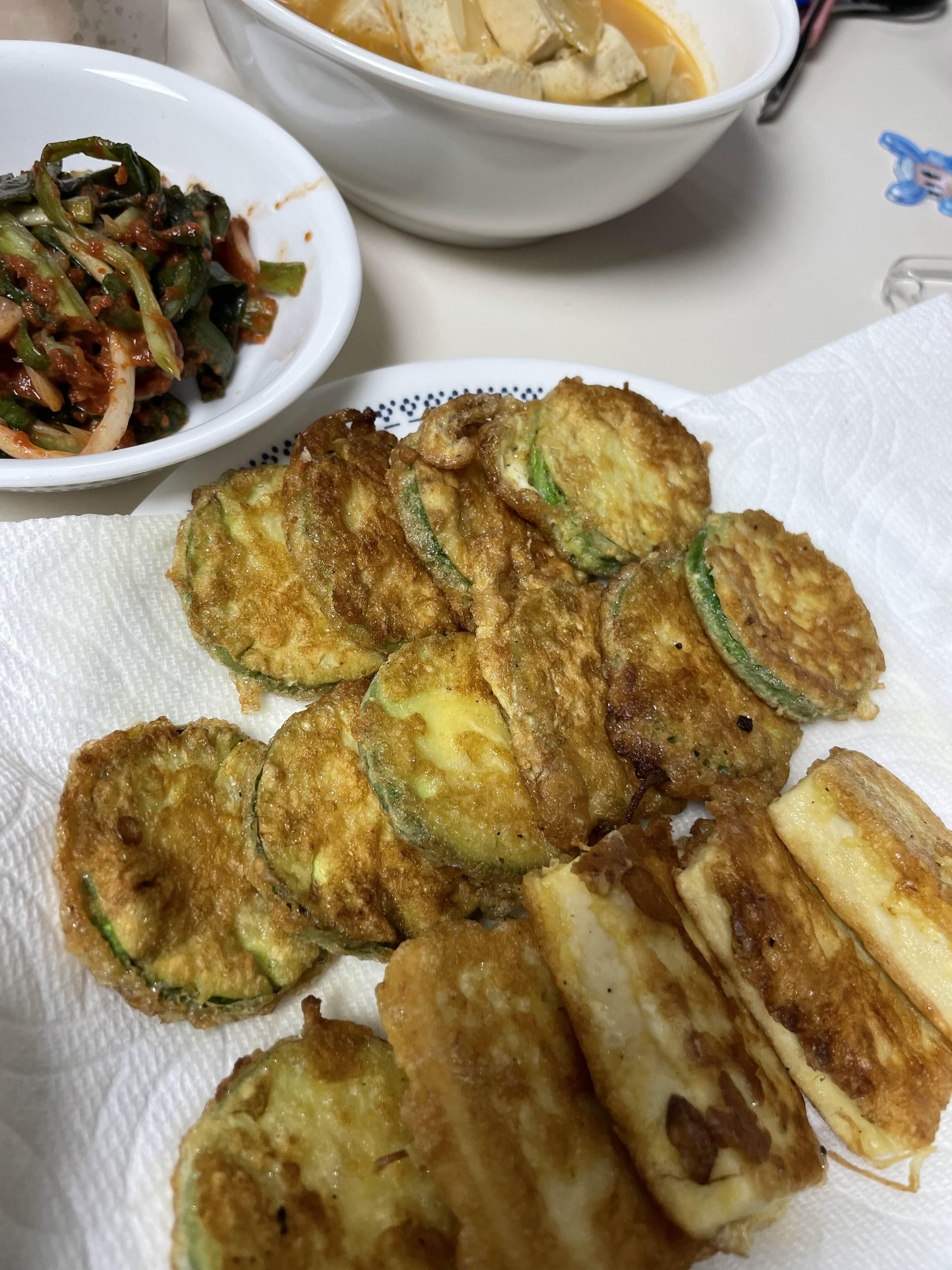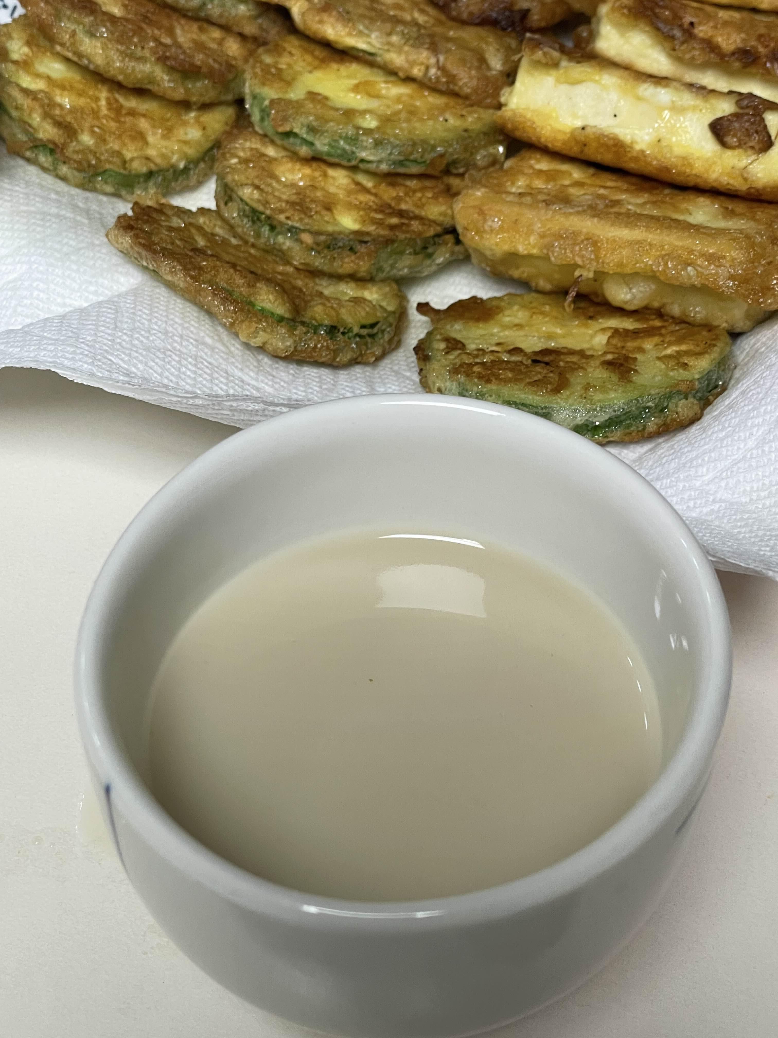막걸리하면 빠질 수 없는 전입니다. 제가 그냥 집에서 부쳤습니다. 막걸리만 보시기 뭣하니 전도 구경하고 가시죠. 나이가 들 수록 쎈 맛의 전보다 호박전, 두부전 같은 담백하면서 재료의 맛이 살아있는 전을 좋아하게 되는 것 같습니다. 12도 짜리의 프리미엄막걸리와 너무 궁합이 잘 맞습니다. 느끼한 전에 질퍽한 막걸리라고하면 안 어울릴 것 같지만 전혀 그렇지 않습니다. 오히려 높은 도수가 담백하게 전의 풍미를 높여줍니다.