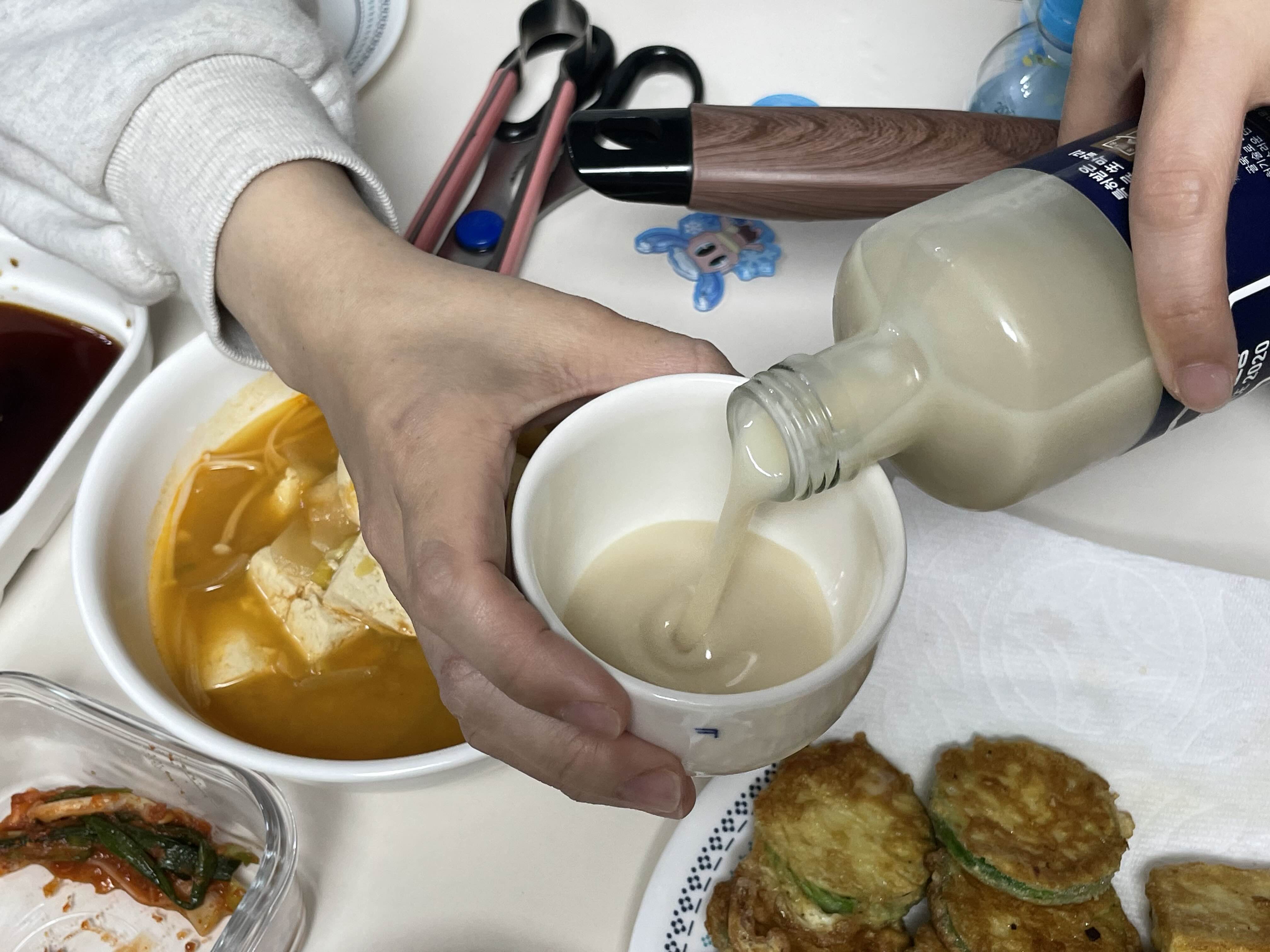대충 상을 차린 후 골목양조장 프리미엄 막걸리를 따라봅니다. 아래 사진에서도 보이지만 질감이 굉장히 걸쭉합니다. 요플레 처럼 걸쭉하게 나오는 게 정말 맘에 듭니다. 한동안 복순도가 처럼 탄산이 강하고 청량감있는 막걸리가 유행을 했던 적이 있었죠. 그런 유행을 건너 이제는 이런 걸쭉한 막걸리가 대세가 되었으면 좋겠습니다. 이게 바로 진짜 막걸리죠.