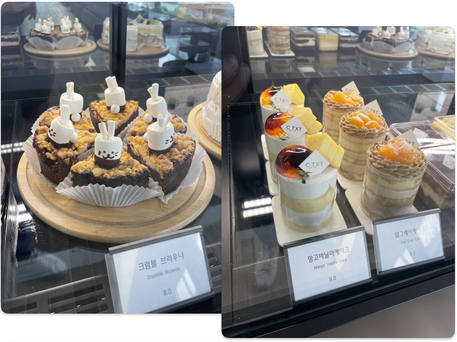 토끼모양의 마시멜로우 조각케익, 그리고 다양한 과일이 올라가 있는 바닐라, 얼그레이 케익도 있습니다. 커피와 함께 먹으면 궁합이 잘 맞을 것 같습니다.