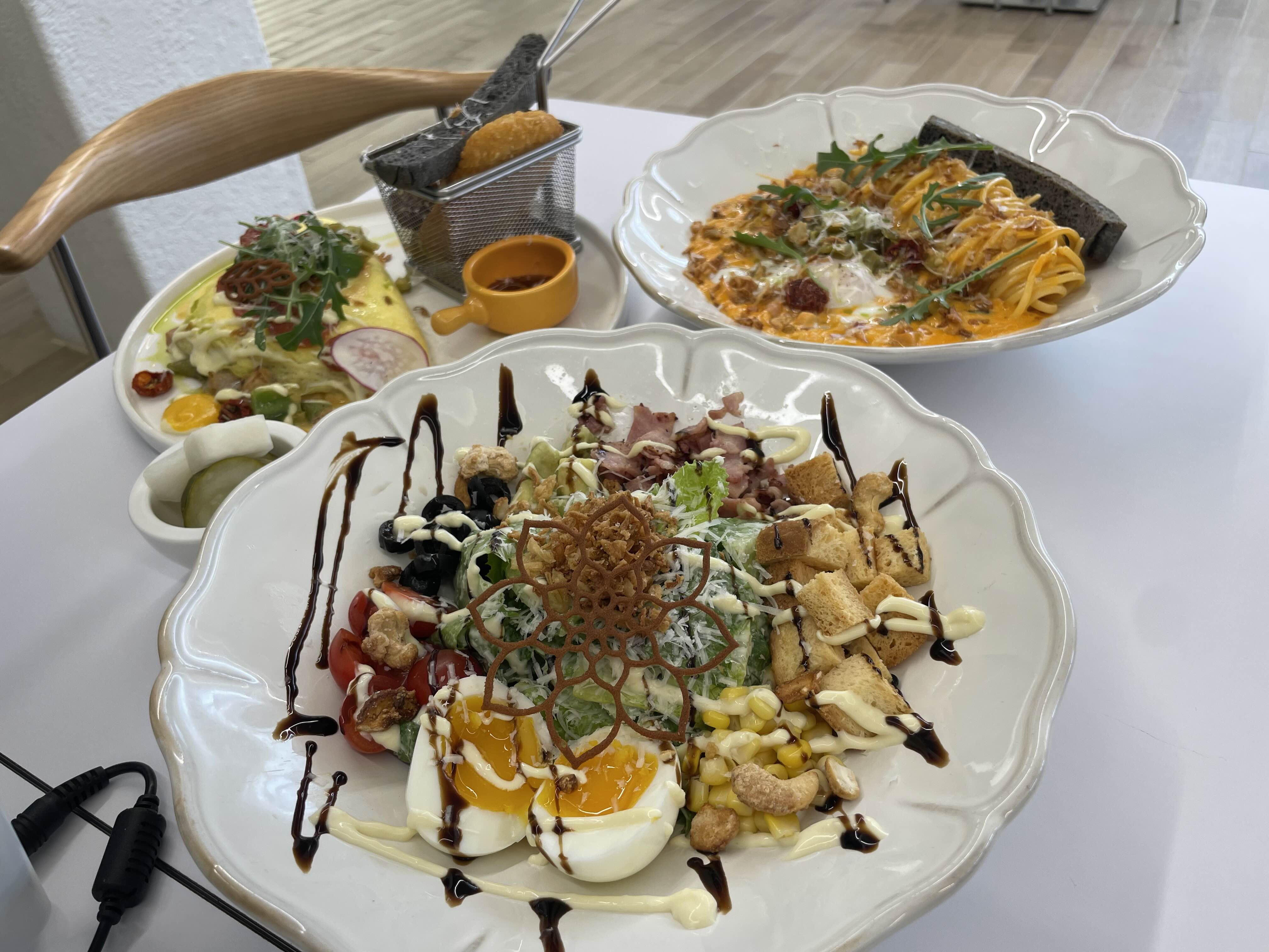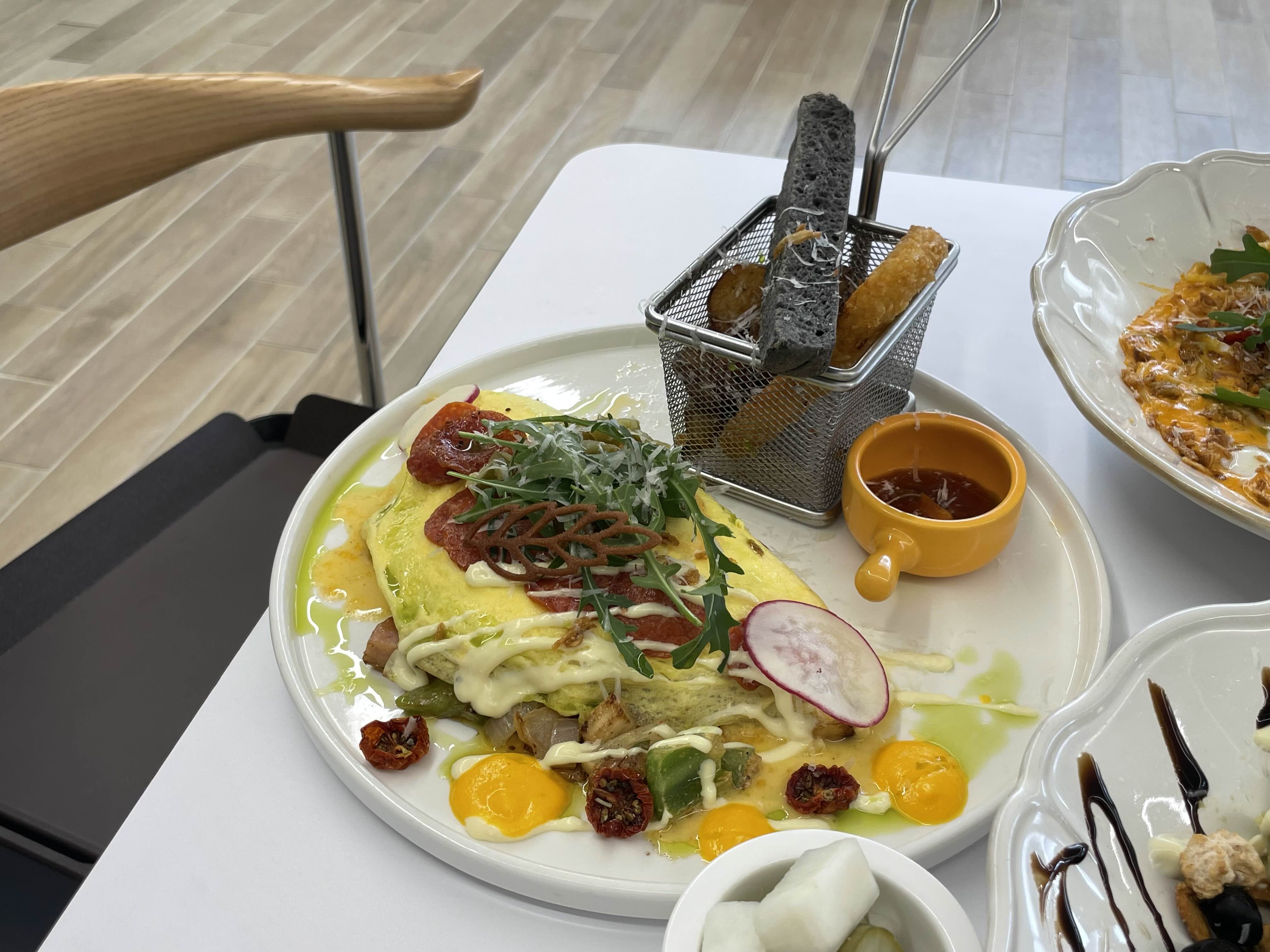 음료를 시키고 나서 카페를 잠깐 구경하는 사이에 요리들이 나왔습니다. 오믈렛과 샐러드가 그리고 스파이시 파스타가 나왔습니다.