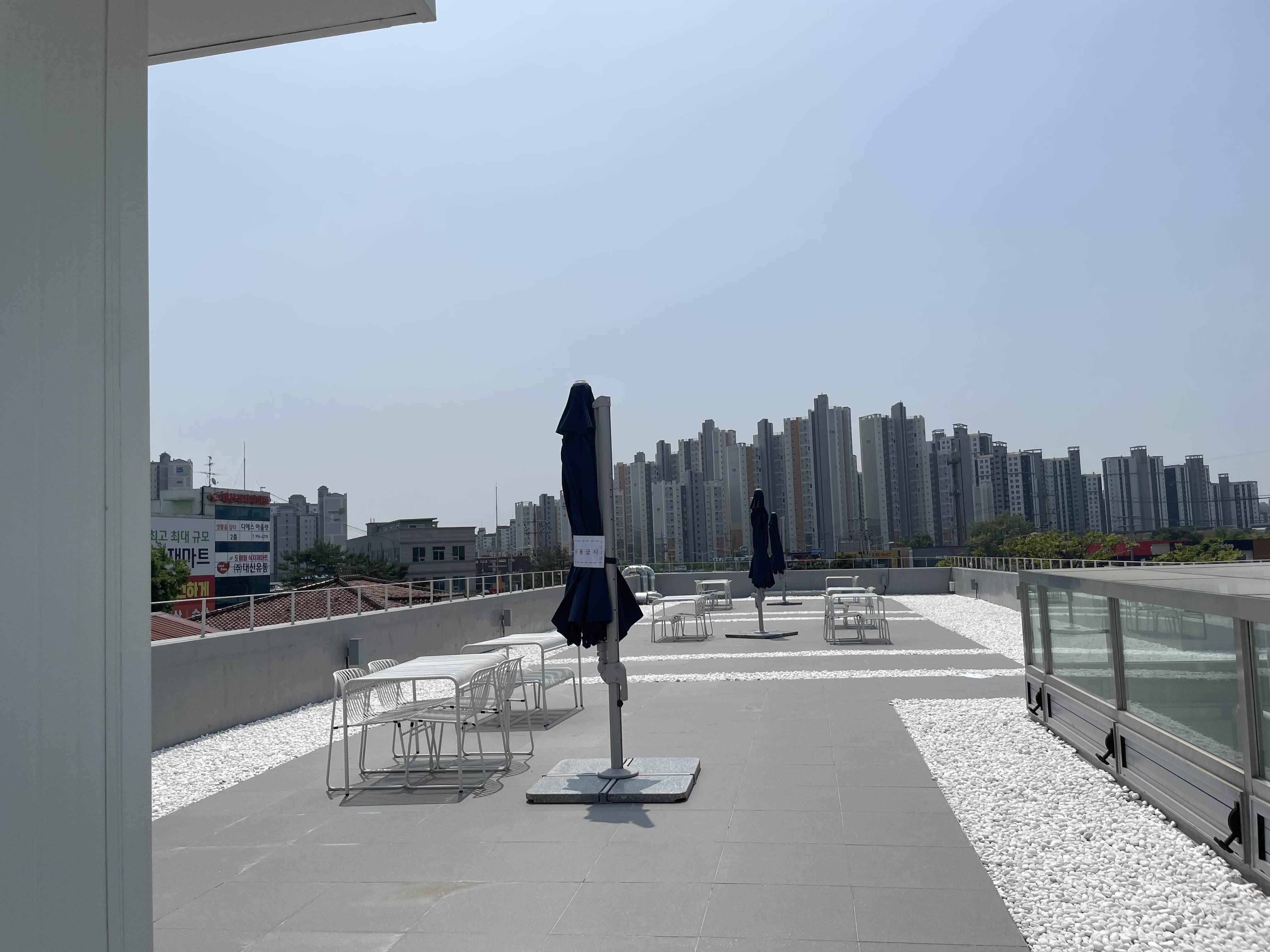 탁트인 하늘과 높은 김포 신도시가 보입니다. 도시의 분주함 속에서 자연 속의 한적함을 느낄 수 있는 곳입니다. 햇살이 따갑긴 했는데 파라솔을 사용하지 못하게 해놔서 이용은 못했습니다만 요즘 같은 봄 날씨에 밖에서 브런치나 커피를 한잔 하기에 좋은 공간입니다.