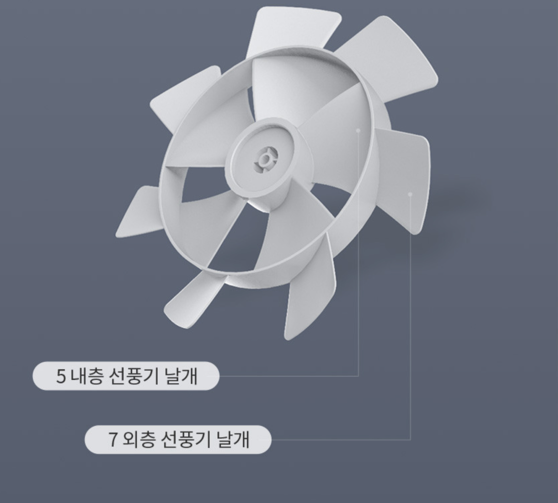 무엇보다 신기한 것은 소음입니다. BLDC 모터니 이중날이니 많은 설명을 하고 있는데 사용자들이 모든 정보를 찾아보기는 힘들 것입니다. 대충 안쪽에는 5개의 날, 바깥쪽에는 7개의 날로 이루어진 2중날 구조의 날이 바람의 세기와 방향을 다르게 설정해서 최적의 풍량을 전달해준다는 설계인데, 실제로 틀어보면 일반 선풍기와 바람의 질이 다르다는 것을 느낄 수 있습니다. 똑똑 끊어지는 바람이 마치 자연풍처럼 자연스럽게 불어오는 느낌입니다.