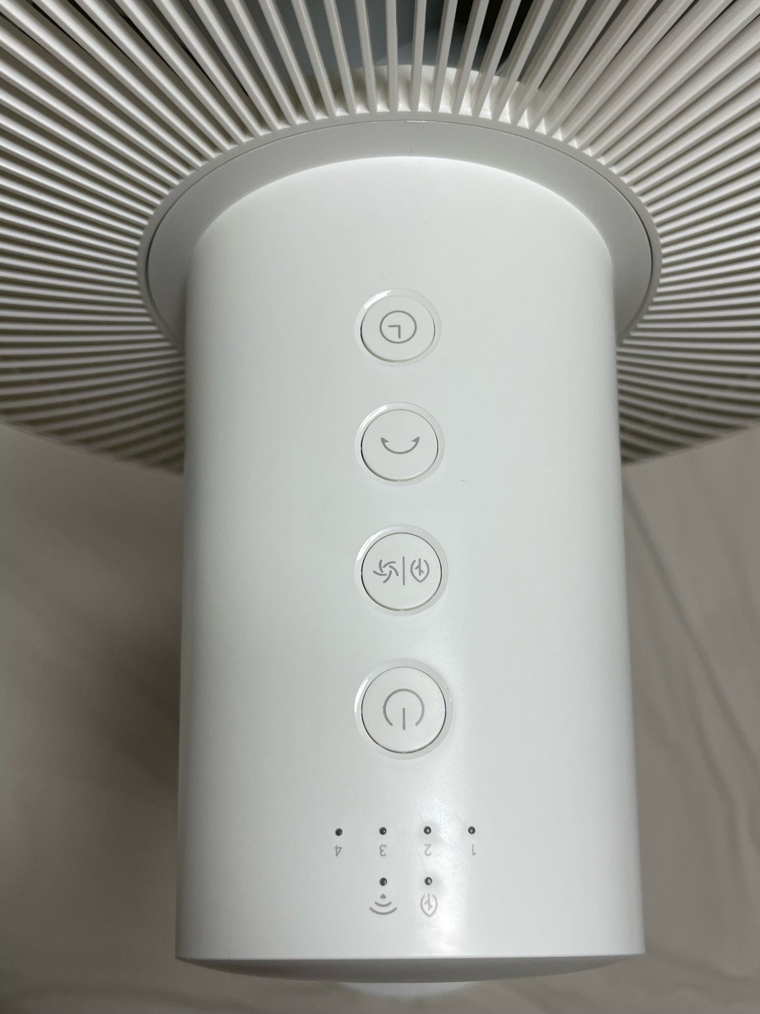 조작방법도 굉장히 단순합니다. 4개의 버튼으로 맨 아랫쪽으로 전원을 켜고 그 위에 버튼의 풍량을 조절하고 또 그 위의 버튼은 회전, 그리고 마지막 버튼은 시간 설정입니다. 네가지 버튼에는 직관적인 이미지로 설명이 되어있어서 설명서 없이 누구나 손쉽게 사용할 수 있습니다.