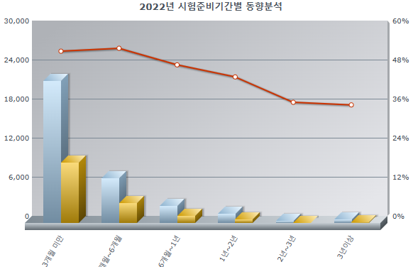 인원별로는 20대가 제일 많고 그다음 30대, 40대 순으로 순차적으로 줄어드는 경향을 보이고 있습니다. 뭐 다양한 통계자료가 있지만 우리에게 가장 중요한 통계는 바로 아래입니다. 합격자의 준비기간입니다.