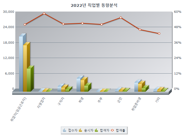 취득자 직업을 봐도 이미 취업해있는 근로자가 월등히 높은 수치를 차지합니다. 그 뒤로 학생이나, 취업준비생이 두번째로 높은 순위를 차지하는데 그만큼 취업보다 실무 중심의 자격이라는 생각이듭니다. 또는 단순히 자기계발을 위해 취득하는 사람의 비율이 월등히 높습니다.
