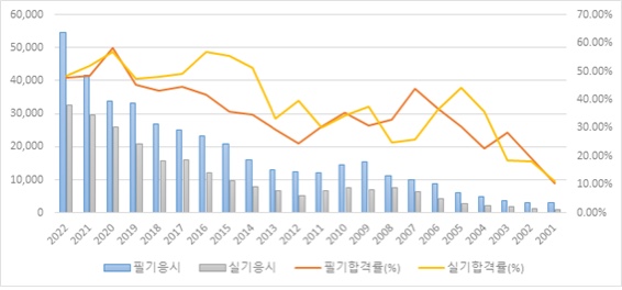 자격취득에 앞서 합격률 추이를 봅시다. 응시인원이 옛날에 비해 월등히 늘어나고 있습니다. 한해에 5만명이상이 보는 시험이라니.. 자격증 취득에 목마른 사람들이 많은 것 같습니다.
