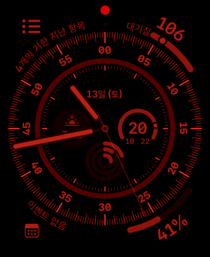 기능도 기능이지만 그 디자인도 경이롭습니다. 기본적인 색도 지원이 되지만 투톤이 3가지(빨검, 파검, 노검)가 지원이 되기때문에 다채로운 색감으로 활용할 수 있습니다. 또 크라운을 조금 돌리면 빨간색화면으로 바뀌는데 밤에 눈이 빛에 적응하기 쉽도록 야간모드로 전환이 되는 것입니다. 그래서 낮이건 밤이건 부담없이 사용할 수 있습니다.