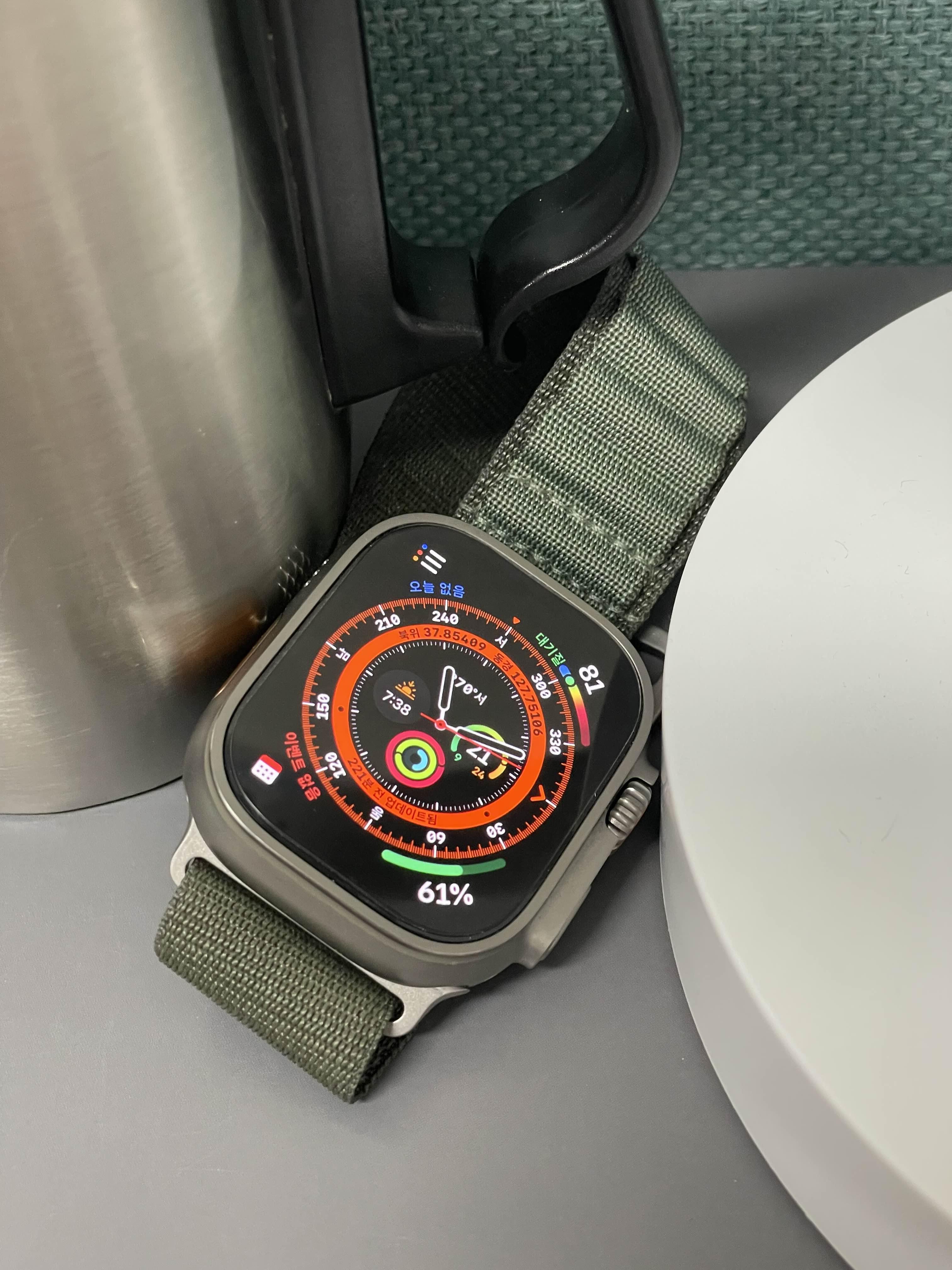 다소 어그로를 끌었지만, 애플워치 울트라에서 나오는 것처럼 제가 사막을 누비고, 극지대를 돌아다니고 물속에 들어가는 일은 일어나지 않았습니다. 극강의 내구성을 가진 티타늄 바디, 정말한 이중 주파수를 가진 GPS, 고도와 위치를 파악해 안전한 생환을 보장하는 길잡이 시스템, 위급 상황에 나의 위치를 160미터 밖까지 알려줄 86데시벨 싸이렌, 100미터 수심에서 활용가능한 방수등급과 수온 측정, 어두운 곳에서 조난시에 사용할 수 있는 2천 니트 밝기의 디스플레이 이 모든 스펙은 저를 위한게 아니었습니다. 그럼에도 그 막강한 기능이 주는 심리적 안정감은 만족스러웠습니다. 어디에 가서도 내가 쉽게 죽지는 않겠구나, 그리고 여태까지 저는 아이들과 워터파크에 가서 수심과 수온을 측정해 보았고, 뒷산에 산책하면서 혹시 모른 조난을 걱정하며 길잡이 어플을 한 번 켜보았을 뿐입니다.