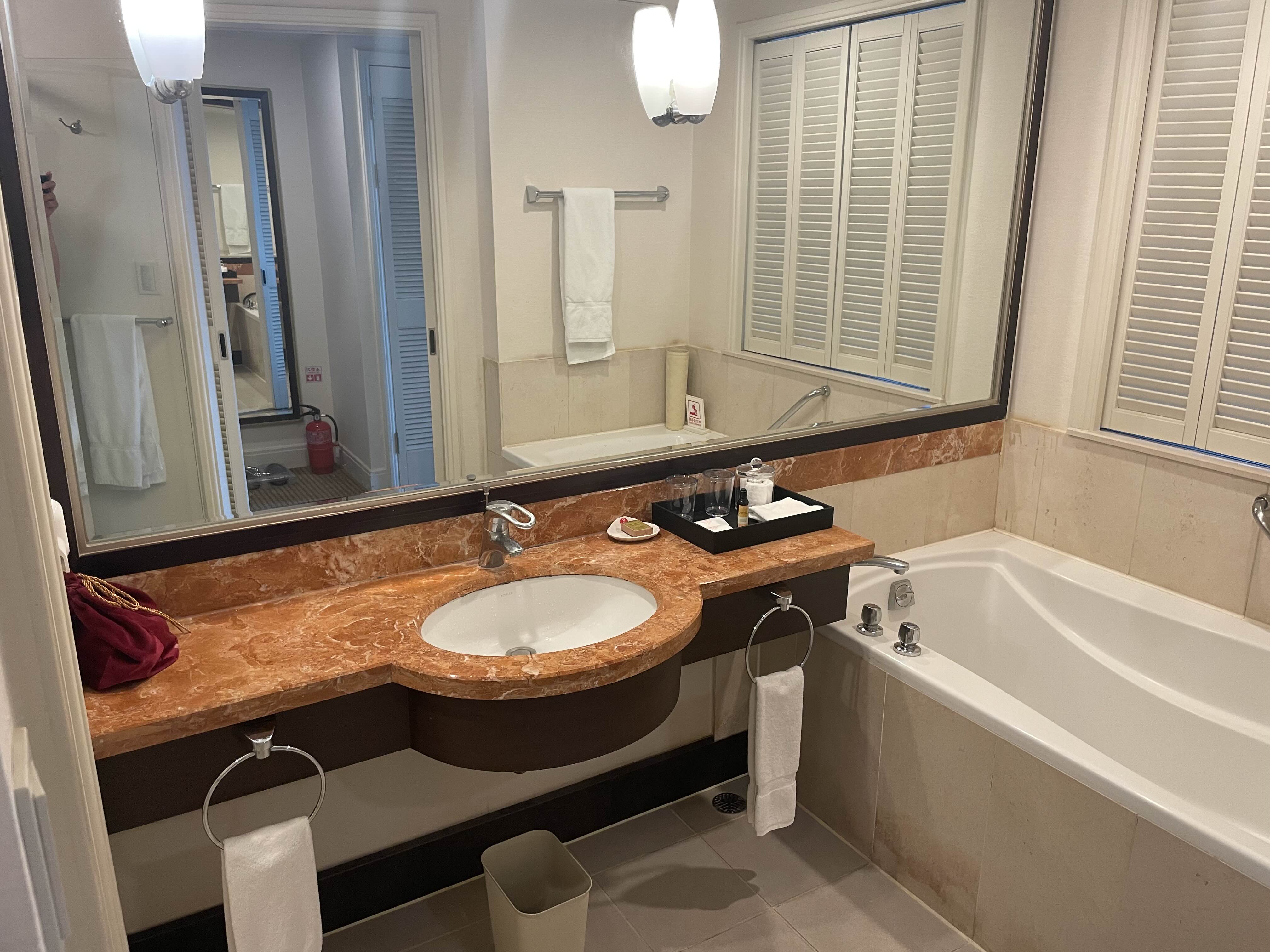 욕실과 화장실도 옛날 호텔 느낌이 물씬 납니다. 그래도 관리는 깔끔하게 되었습니다. 참고로 저 창은 열립니다. 욕조 안에서도 창을 통해 한라산을 볼 수 있습니다. 모든 문은 이런식으로 사선모양의 나무로 되어있어서 통풍은 잘될 것 같습니다. 다만 단점은 화장실…. 소리도 잘 들린다는 것이겠죠.