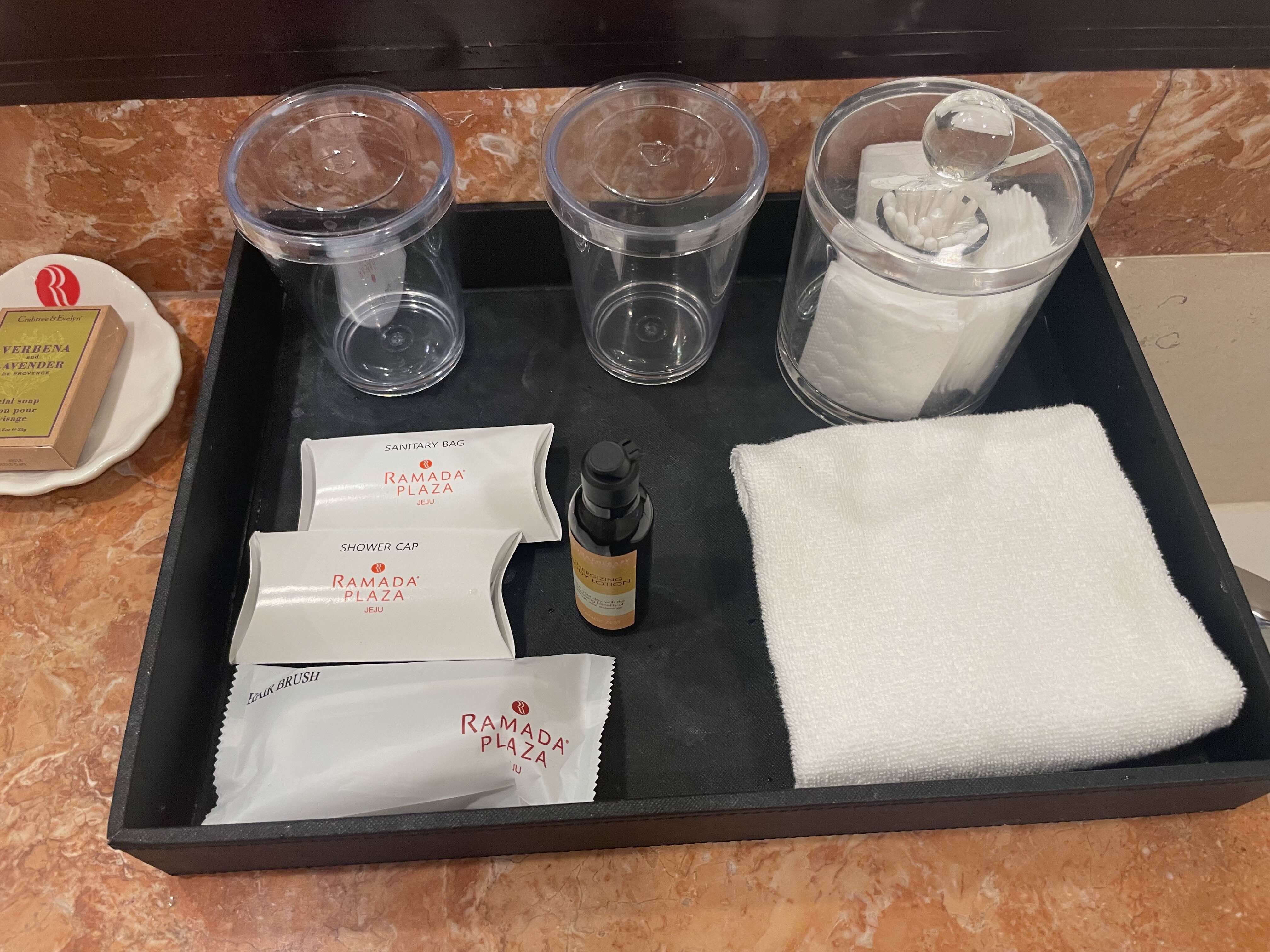 세면대에는 항상 있는 면봉, 수건, 그리고 바디로션, 비누, 샤워캡 등이 있습니다.