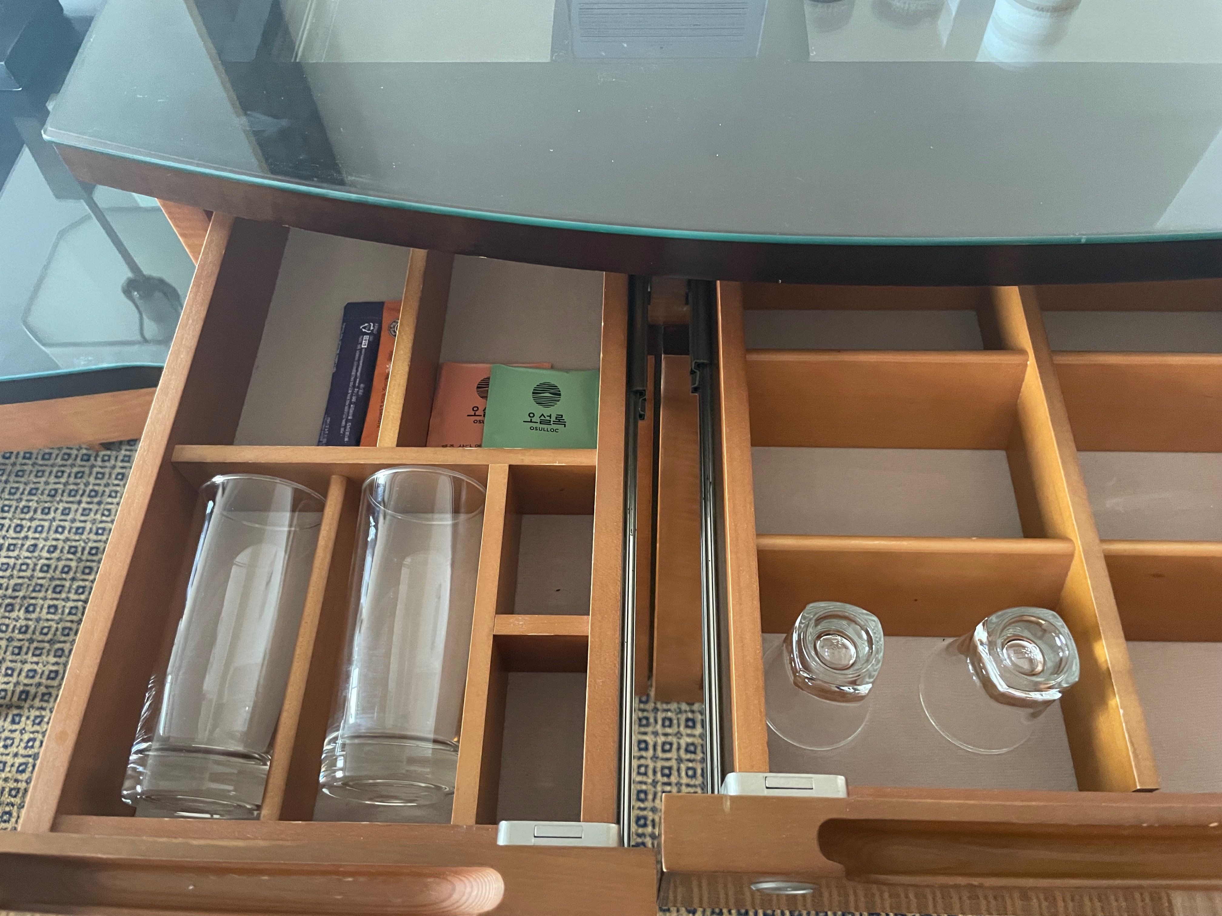 서랍 안에는 컵과 간단한 티백, 커피가 있습니다.