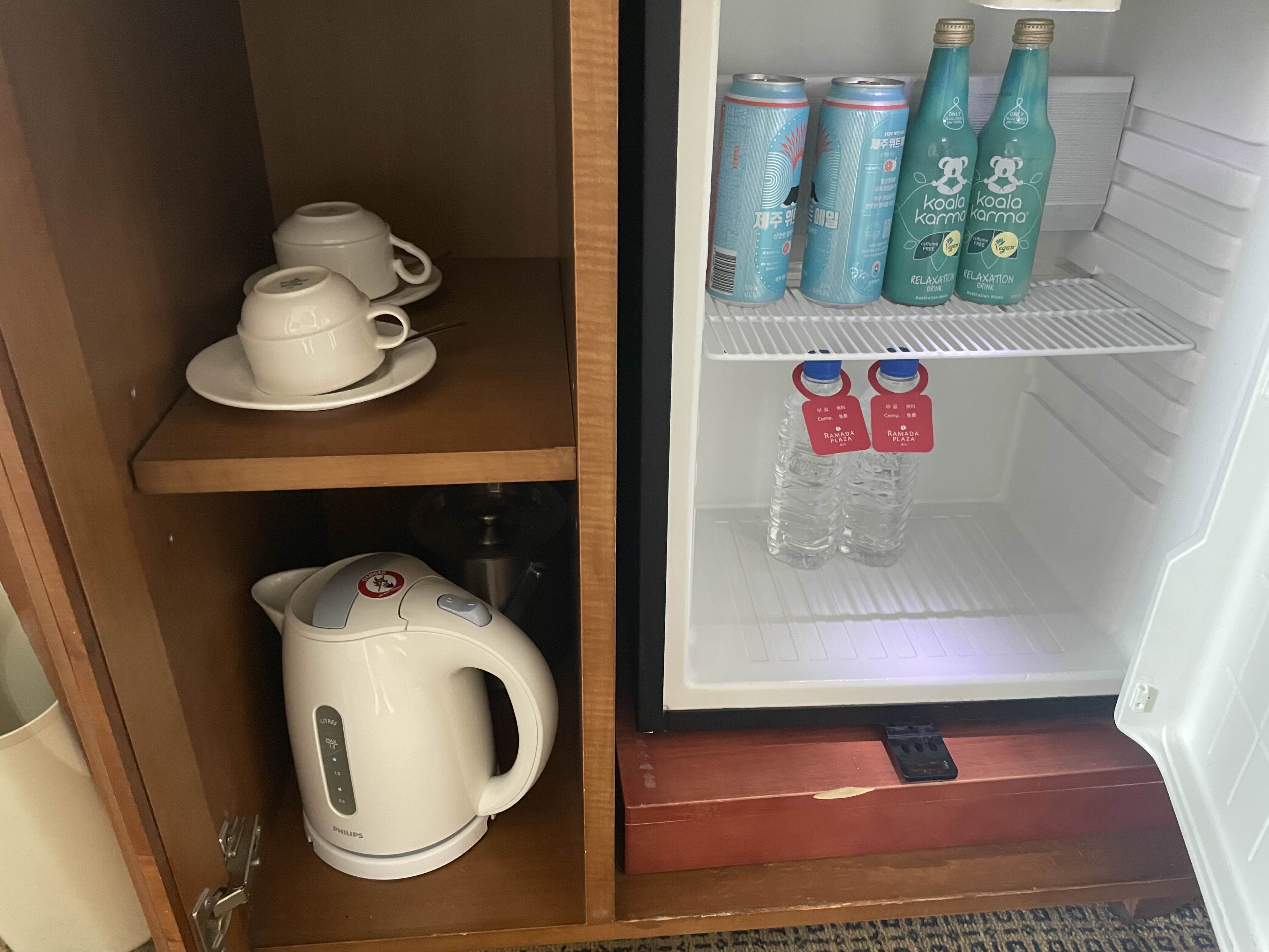 그 아래는 커피포트와 잔이 있습니다. 그리고 오른쪽 냉장고에는 또 셀프바를 통해 먹을 수 있는 제주도 술, 그리고 꽁짜로 제공되는 물이 개 제공되고 있습니다. 꽁짜는 물밖에없습니다.