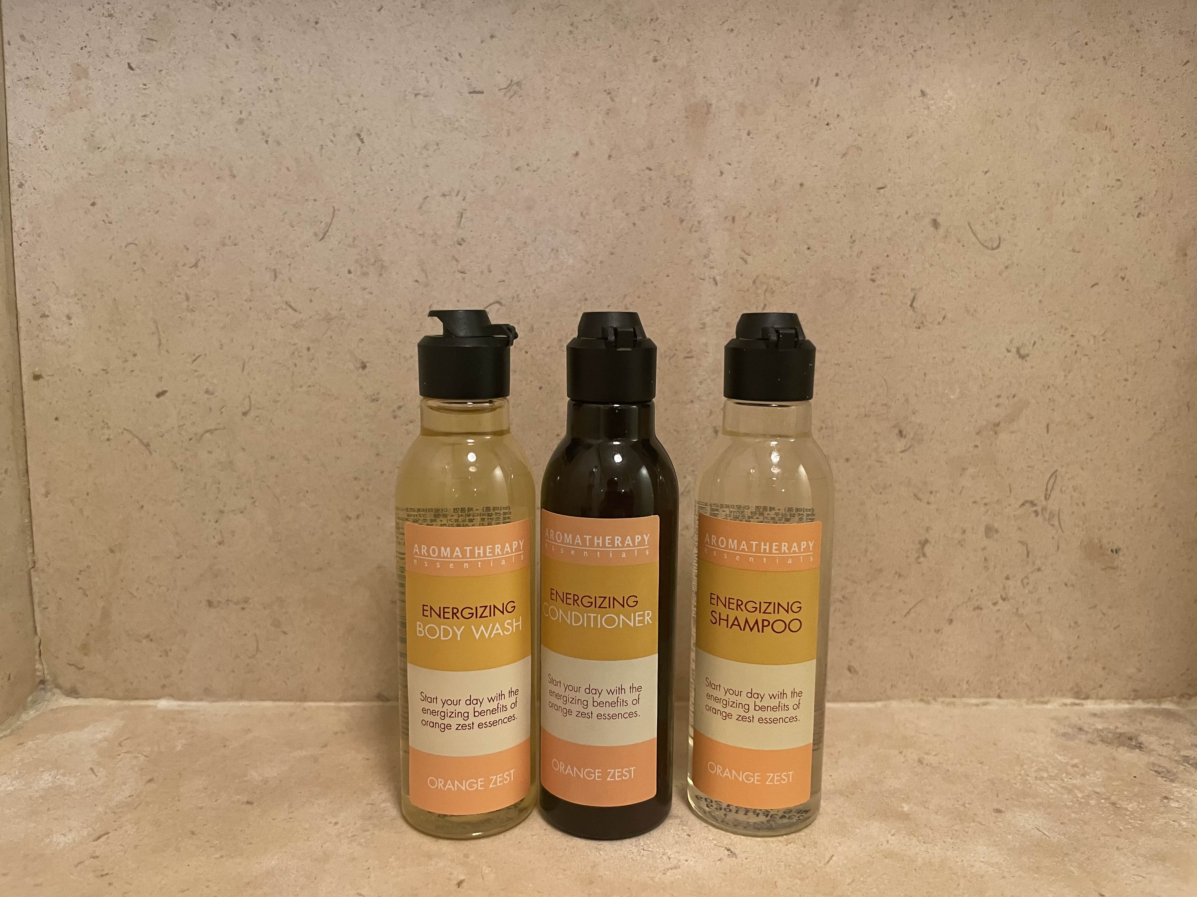 어메니티입니다. 제주도라 그런지 어메니티에서는 오렌지 향이납니다. 샴푸, 컨디셔너, 그리고 바디워시가 욕실에 비치되어있고 아까 세면대에 있던 바디로션까지 총 4종이 갖춰져 있습니다.