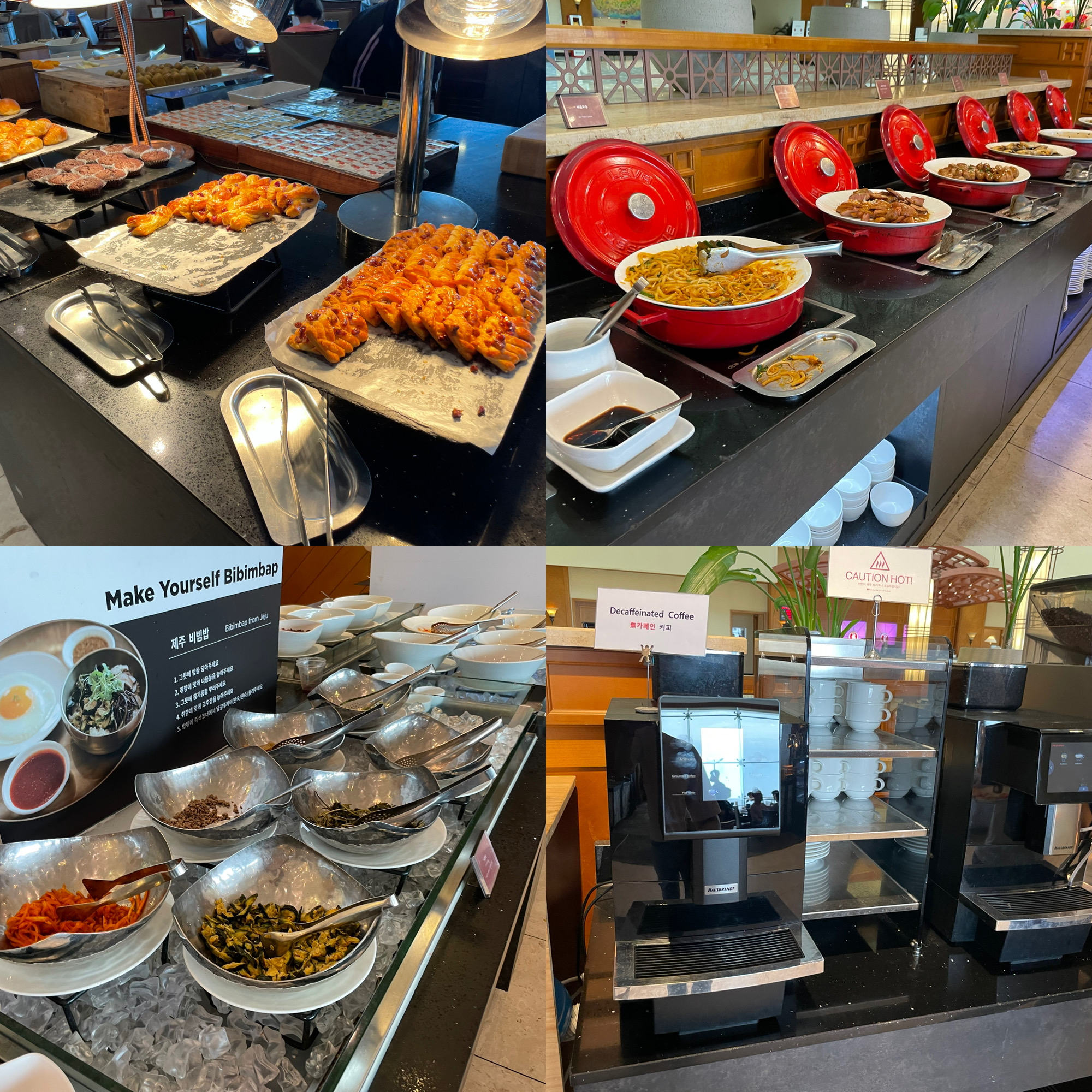 다음날 아침 부지런히 일어나서 조식을 먹었습니다. 8시에 도착해서 오믈렛을 먹으려고 했는데 조리하시는 분이 버거워하실 정도로 많은 사람들이 있어서 간단히 쌀국수만 먹고 나머지는 조식부페에서 떠먹었습니다. 쌀국수도 시원하니 맛있습니다. 다양한 음식들이 있었고, 제주도 비빔밥이라는 특색있는 음식이 있어서 한번 먹어보았습니다. 커피도 디카페인 커피머신도 준비되어 있었습니다.