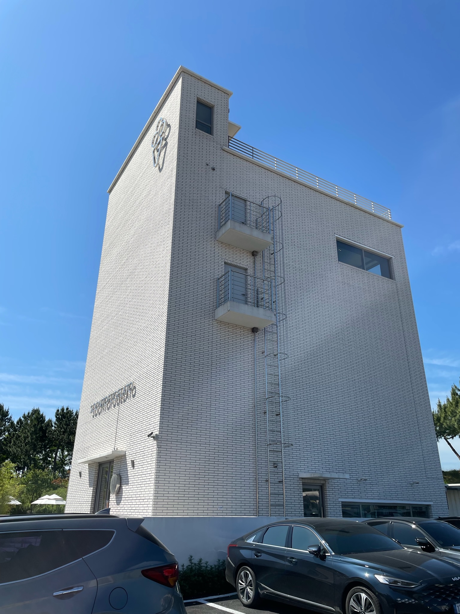 자연과 어우러지는 아름다운 3층 하얀색 벽돌 건물
