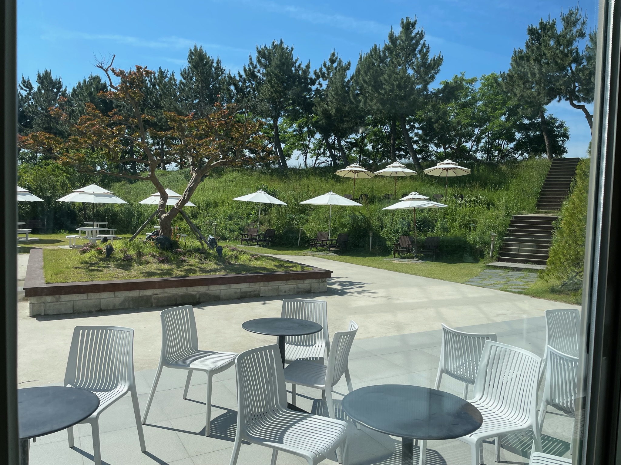 날씨가 좋아서 어디를 찍어도 예술입니다. 파란 하늘과 초록 풍경을 만끽할 수 있는 야외 자리도 준비되어있습니다. 여름에는 좀 더울 것 같은데요. 6월 초인 오늘은 있을만 했습니다. 파라솔 밑에 있으면 그렇게 까지 덥지는 않았습니다.