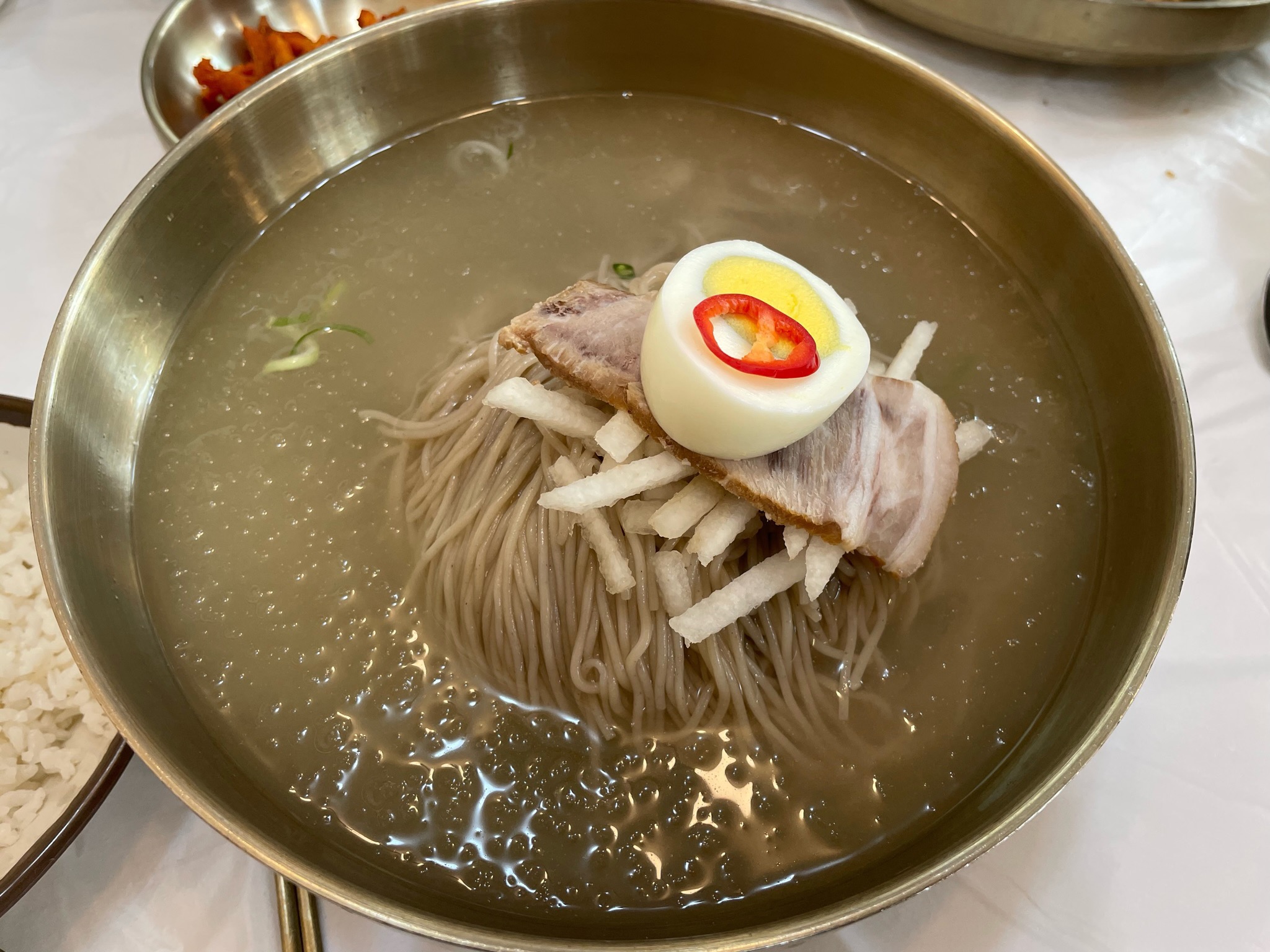 드디어 메뉴가 나왔습니다. 살어름에 채썬 배, 그리고 편육이 올라와 있고 그 위에 삶은 계란과 고추 고명이 아름답게 올라가 있습니다. 육수에 파가 썰려 들어가있는게 특이합니다. 맛은 우리가 익히 아는 평양냉면 맛입니다. 그리고 좀 더 깊은 풍미가 나면서 슴슴함이 특색이라는 평양냉면이아닌 진짜 깊은 평양냉면 맛이 납니다.