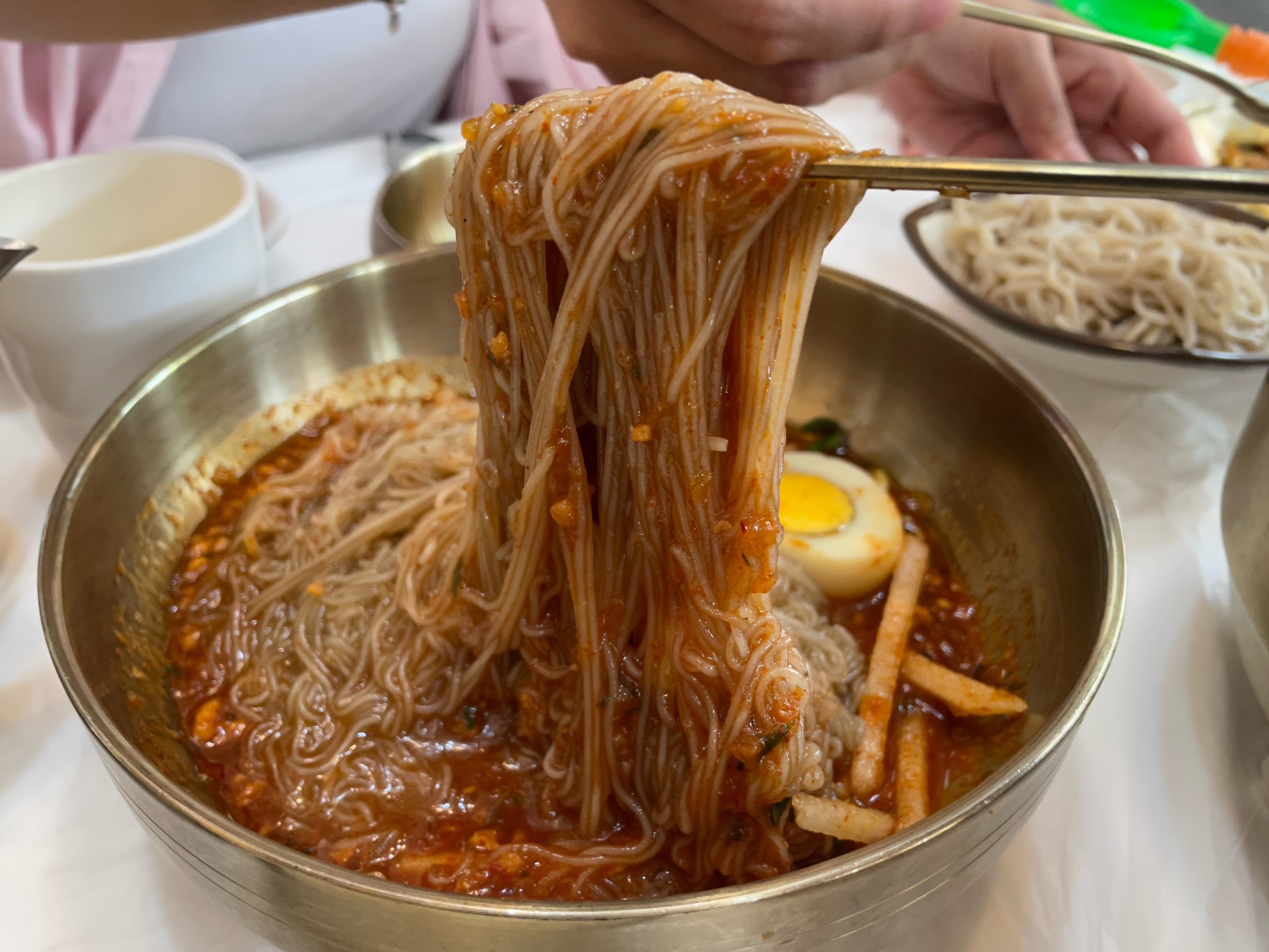 다음은 함흥냉면입니다. 전분면으로 시켰죠. 고명이 살짝 바뀌어있는거 보이시죠? 계란위에 계란지단이 올라가 있습니다. 비빔장이 풍부하게 들어가 있고 따로 육수는 주지 않습니다. 안주셔도 비비는데 크게 문제는 없었습니다. 그리고 저는 평양냉면도 평양냉면이지만 이 비빔냉면을 더 높게 평가하고 싶습니다.
