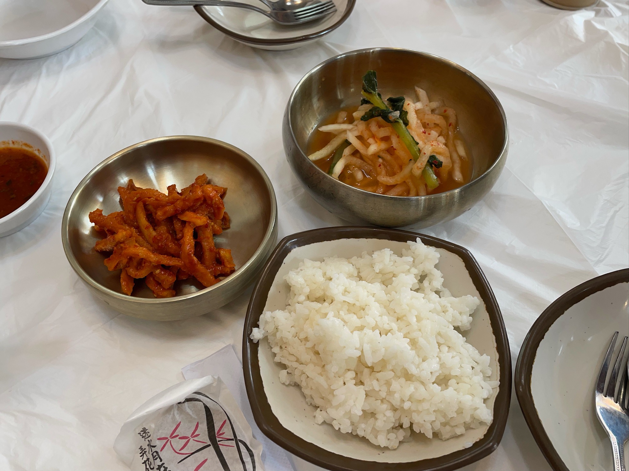 기본찬으로 나오는 무말랭이와 무김치입니다. 무김치랑 무말랭이만해도 밥한그릇 뚝딱입니다. 무말랭이는 맵습니다. 무 김치는 맵지는 않고 시원한 맛이납니다. 둘다 냉면과 아주 잘 어울릴만한 반찬입니다. 아래를 보시면 밥이 있죠?