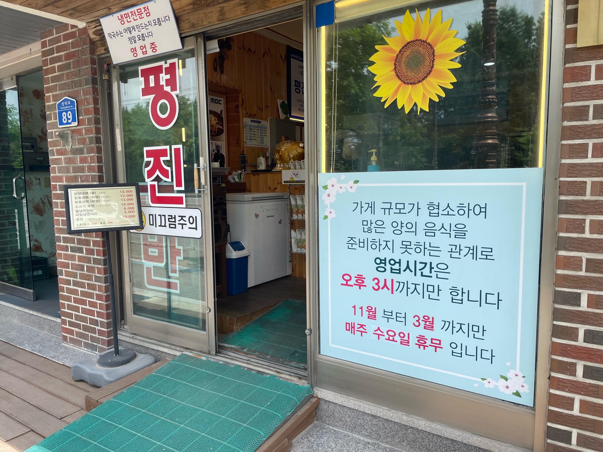 막국수는 어떻게 만드는지 방법도 모른다는 평진 냉면집 사장님. 가게 규모도 협소합니다. 영업시간은 오후 3시까지! 느낌이 오시죠. 근본있는 가게입니다. 심지어 휴일도 없습니다. 동절기에만 매주 수요일 휴무한다고 합니다. 아무래도 냉면집이 동절기에는 장사가 잘 안되긴하죠.