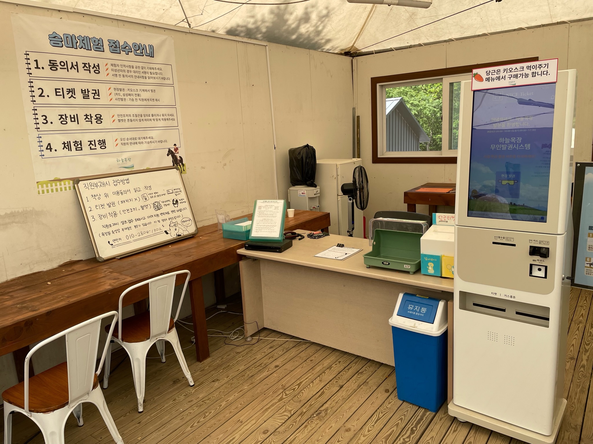 승마체험장 내부에는 키오스크와 승마체험에 대한 안내가 있습니다. 직원이 한두분씩 상주해서 승마체험을 도와주십니다.