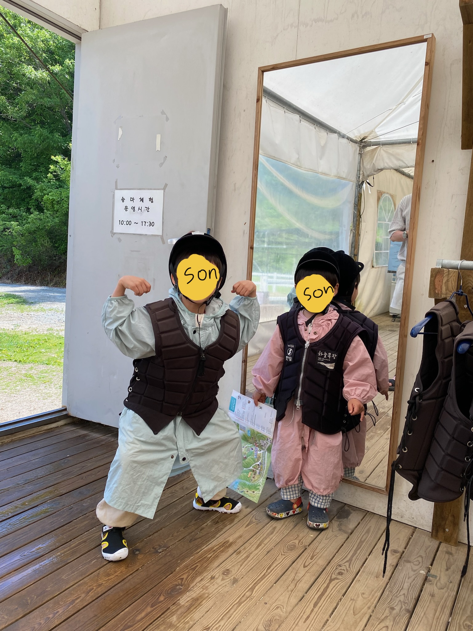 조끼와 모자만 썼는데도 승마를 엄청잘하는 사람처럼보이죠? 그냥 말타고 휙 도는 건데 나름 신경써서 입었습니다. 옷을 입기만해도 신난지 벌써부터 늠름한 모습을 보이는 아이들입니다.