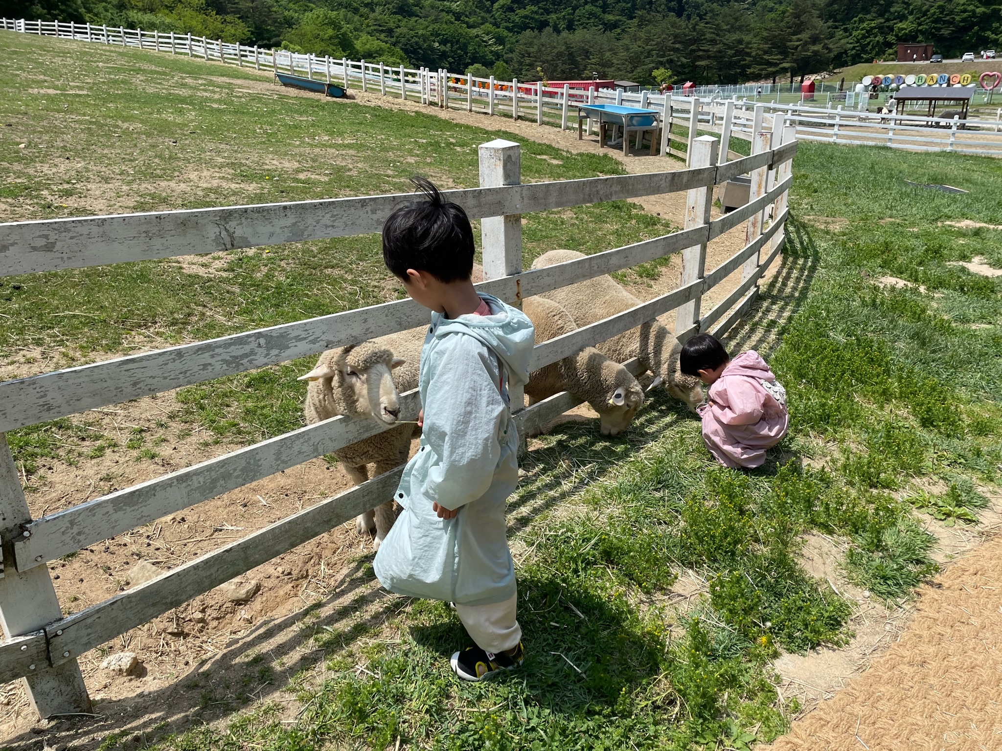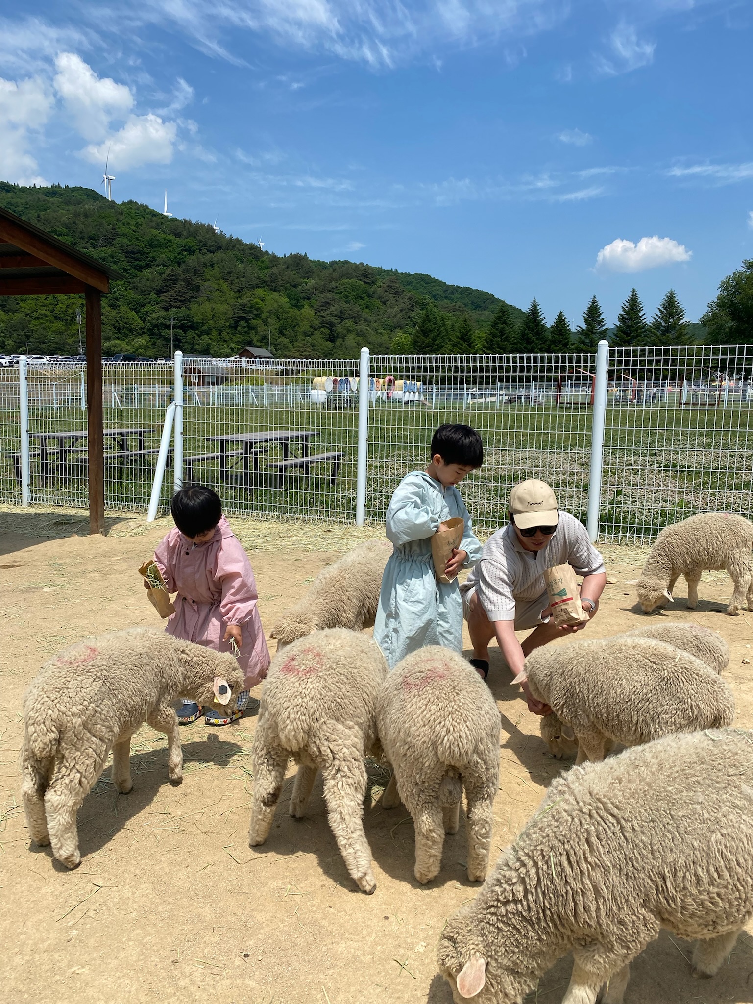 저도 아이들과 함께 먹이주기 체험을 합니다. 울타리를 넘어 들어가면 새끼 양들이 있는데 아직 아침이라 그런지 미친듯이 옵니다. 먹으를 손에 올려서 줘도 물지 않습니다. 간혹 물리기도 하는데 그렇게 아프지는 않습니다. 혀를 꺼내서 손바닥을 살살 핥아 먹는 정도죠.