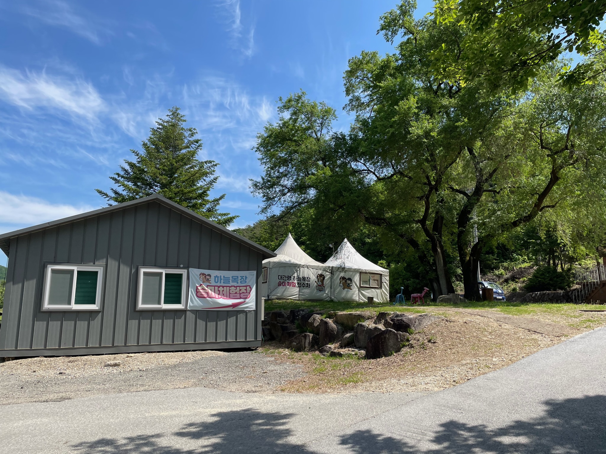 좌측으로 가서 어린이 놀이터를 지나고 트랙터 승차장을 지나면 하늘목장 승마체험장이 나옵니다. 조립식 건물 옆에 있는 하얀색 텐트가 바로 승마체험장입니다.