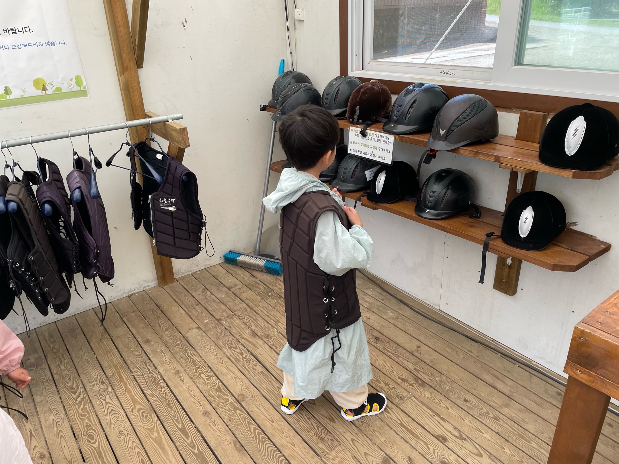 말에 타기에 앞서 승마 도구부터 챙깁니다. 조끼와 모자를 몸에 맞는 것으로 골라 입어줍니다.