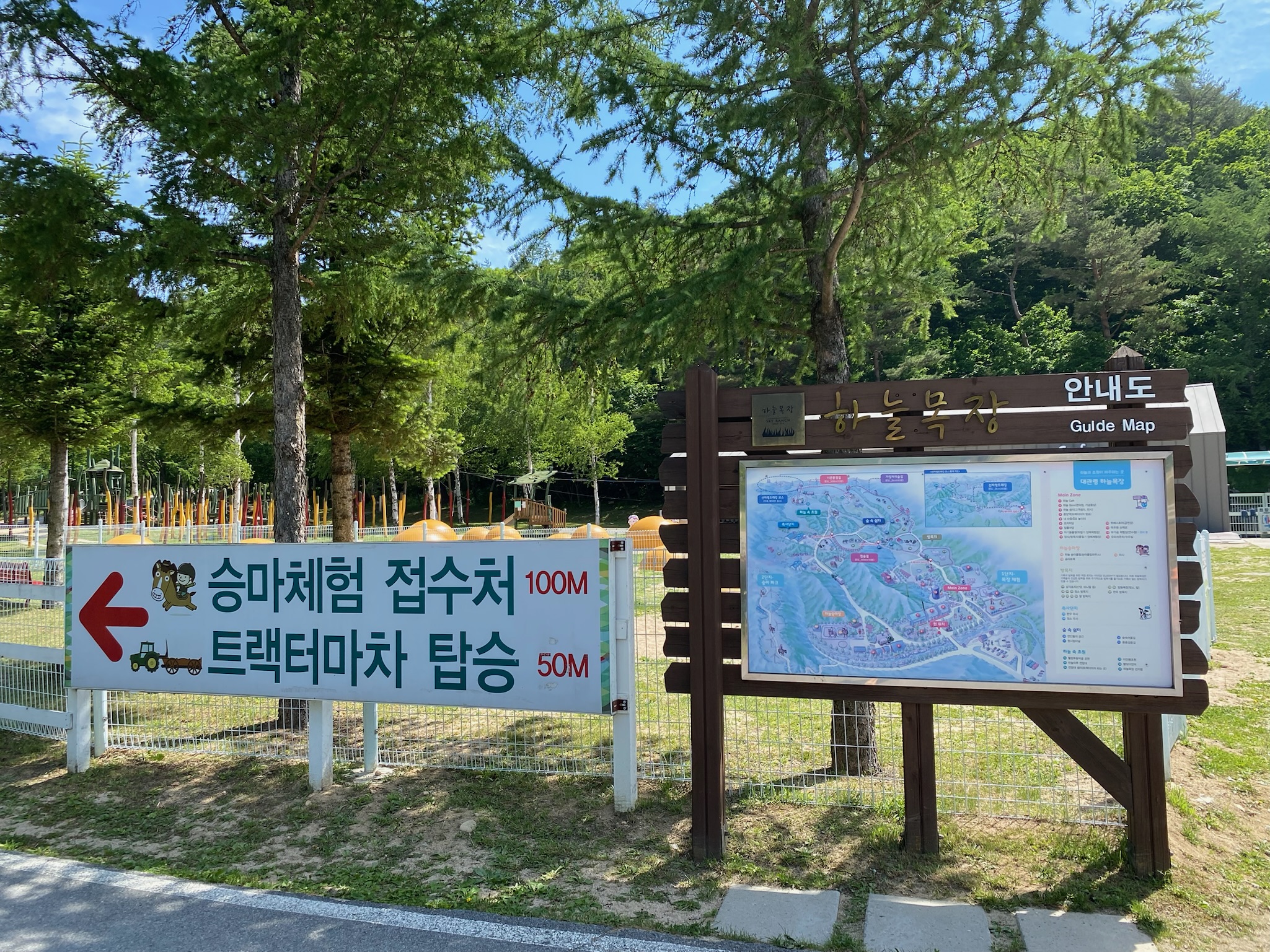 경치를 구경하면서 살짝 걸으니 하늘목장 안내도가 나옵니다. 좌측으로 가면 승마체험과 트랙터마차 탑승장, 우측으로 가면 먹이주기 체험장입니다. 저희는 승마체험을 한 뒤 트렉터마차에 탑승해서 정상을 다녀올 계획이므로 왼쪽으로 갑니다.
