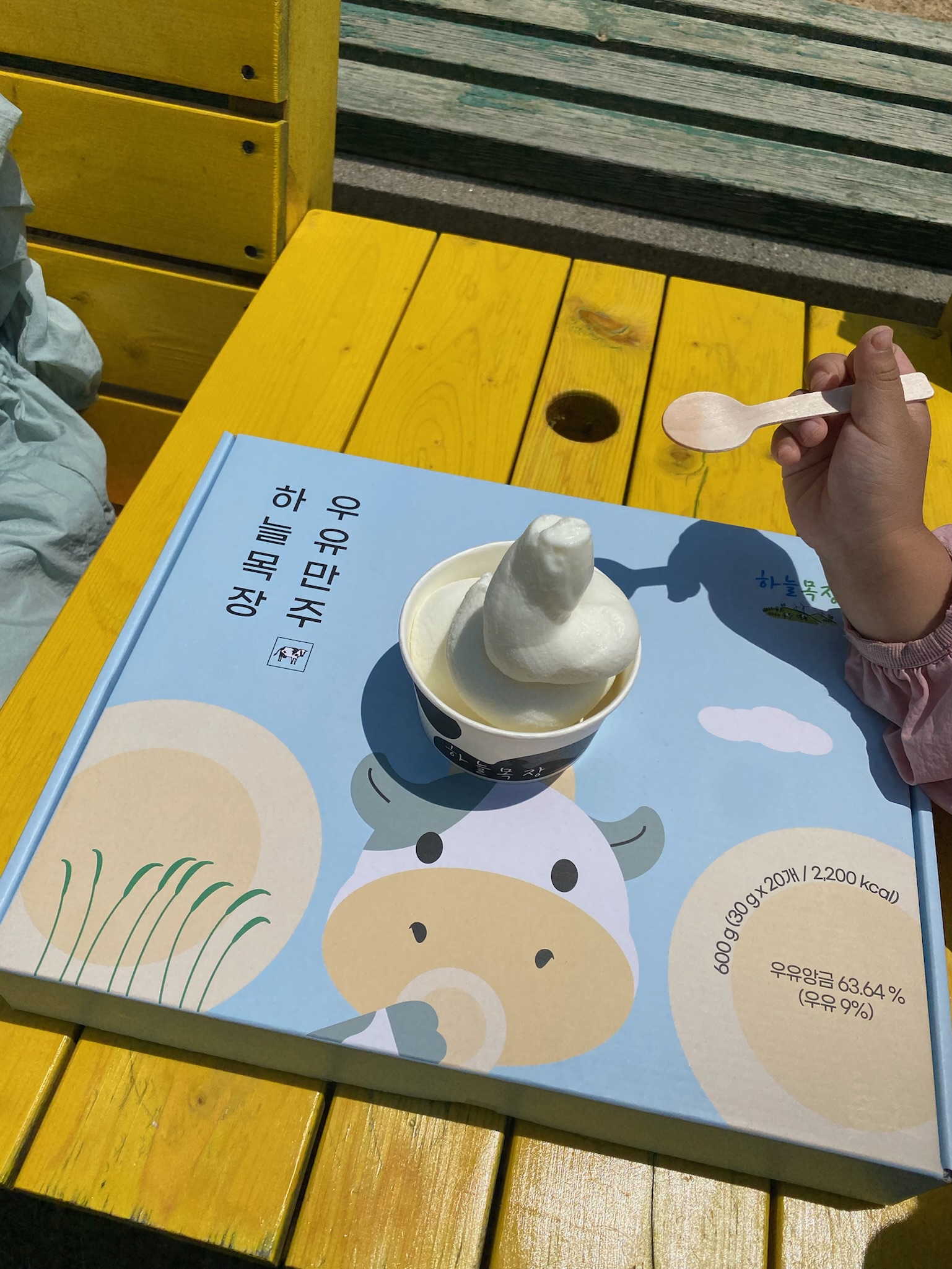 목장에 왔으니 우유를 먹어봐야죠 소프트 아이스크림과 대관령 하늘목장에서만 판다는 만쥬를 먹어보았습니다. 직접 생산한 우유로 만든 만쥬와 소프트 콘입니다. 다들 아실만한 맛이지만 기분 때문인지 더 고소한 맛이 났습니다. 환경을 위해서 나무로 만든 숫가락을 줍니다.