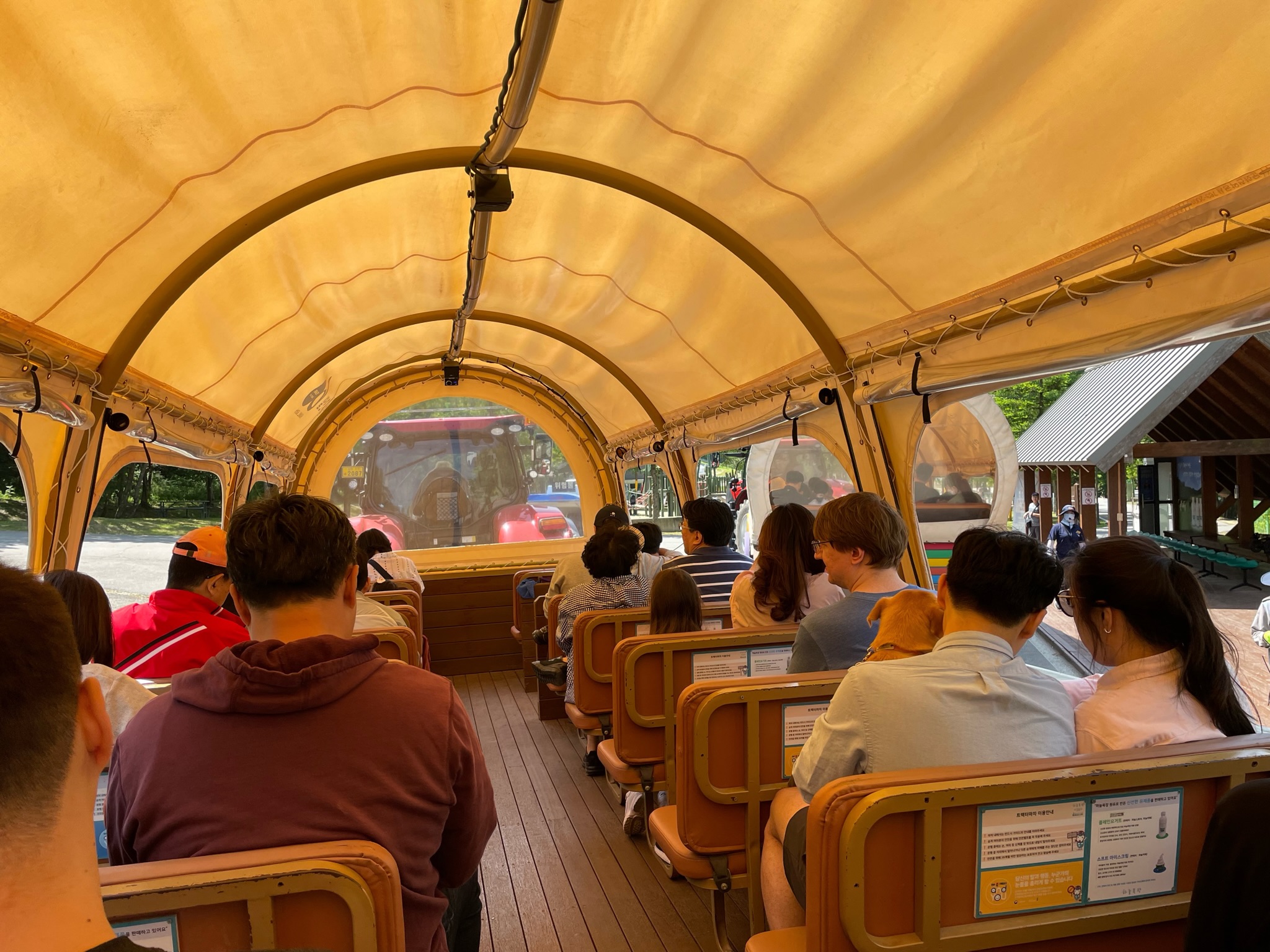 후다닥 승마체험을 마치고 나서 10:30분에 출발하는 트랙터를 타러 갑니다. 한번에 두대의 트렉터가 이동을 하는데 60명 이상은 탑승할 수 있는 것 같았습니다. 가장 처음 운행시간이 10:30분이었기에 저희는 부랴부랴 탑승하러 갔습니다. 승마체험장 바로 옆에 탑승장이 있기 때문에 이동이 어렵지는 않습니다.