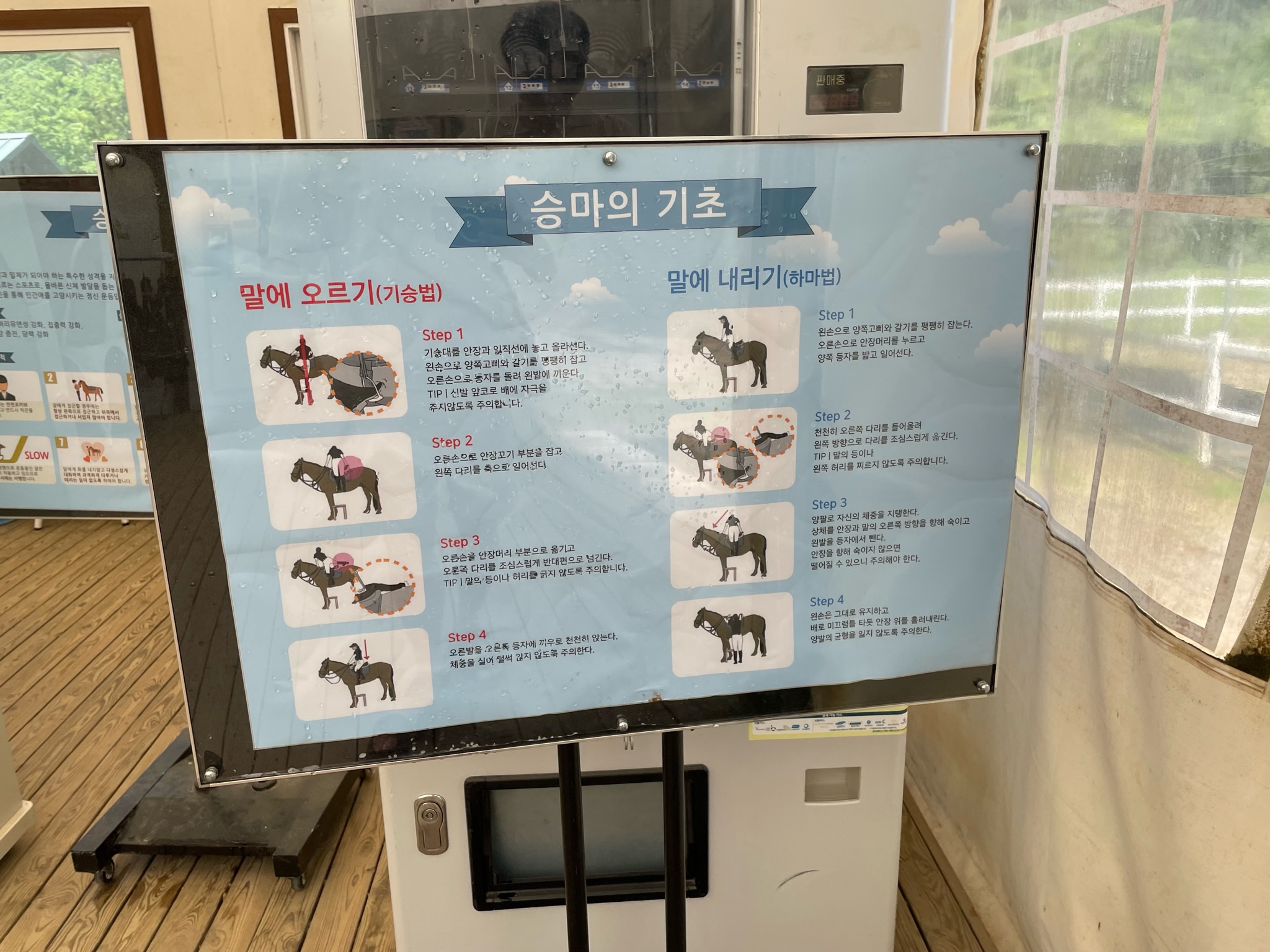 승마의 기초에 대해 설명이 되어 있는데 준비를 하면서 한번 읽어보기에 좋습니다. 실제로 말을 타고 내릴 때는 직원분들이 도와주시기 때문에 크게 걱정할 필요는 없습니다.