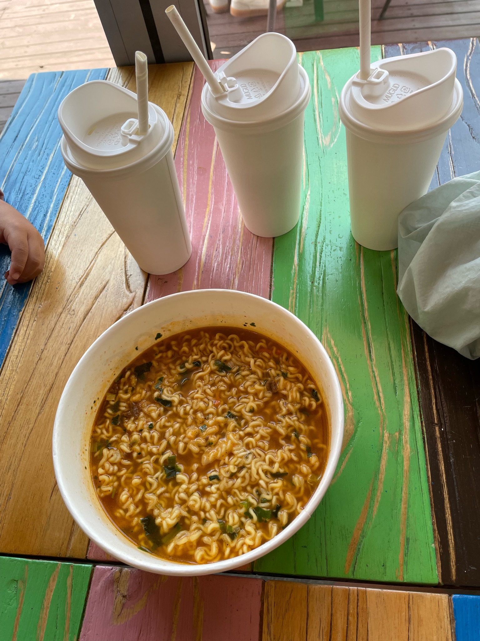만쥬와 소프트콘을 먹었으니 이제 음료와 라면도 먹습니다. 아주 이것저것 알차게 먹었죠. 음료는 라떼와 딸기우유, 그리고 시원한 레몬에이드를 시켰습니다. 라떼도 커피맛보다 우유맛이 돋보였습니다. 딸기우유는 딸기가 바닥에 가라앉아 있어 휘휘 잘 휘져어 먹어야 끝까지 맛있는 딸기우유를 먹을 수 있습니다. 라면이야 뭐 말할 나위가 있나요.