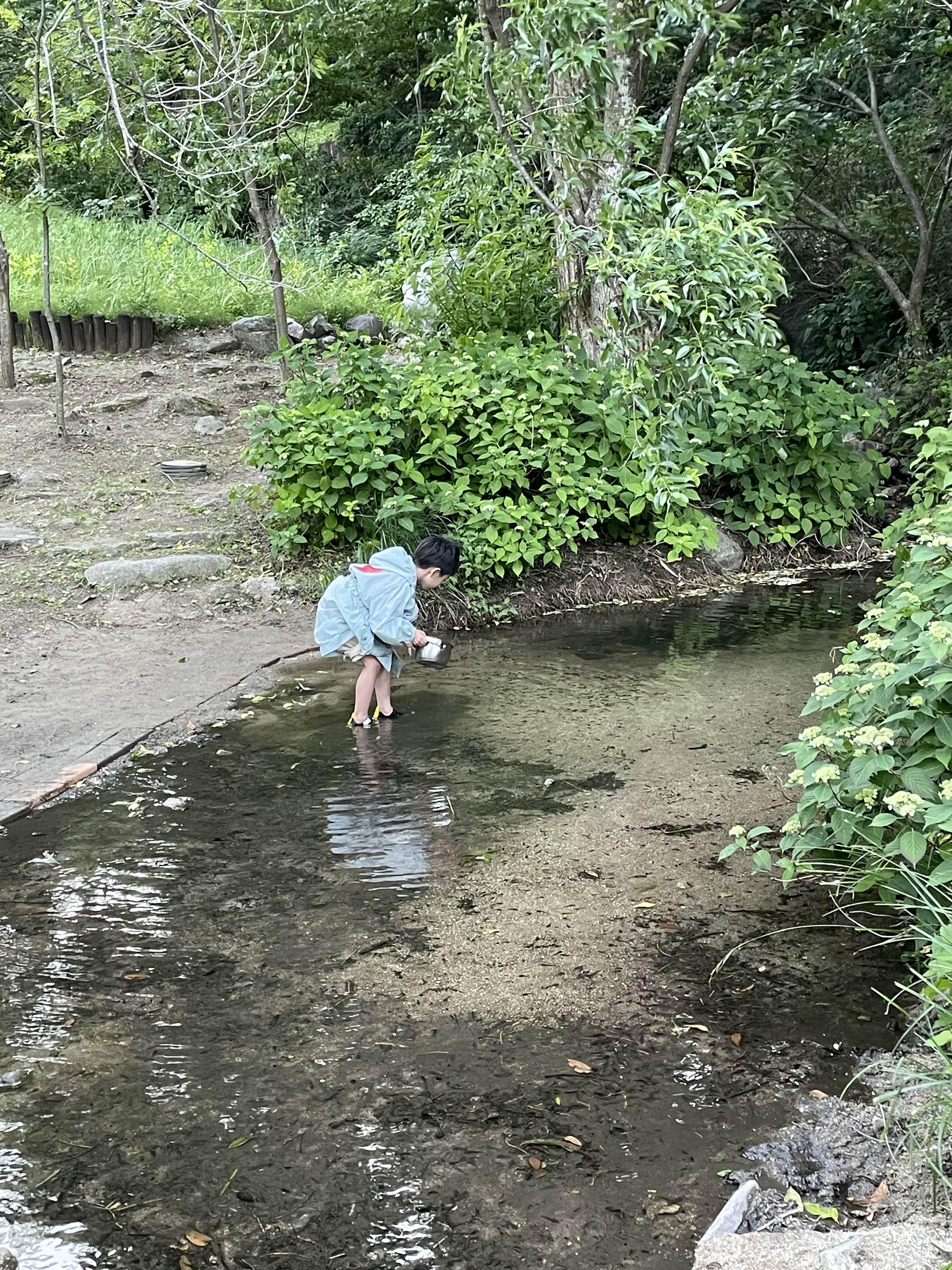 냄비를 들고 조심스럽게 잡아봅니다. 여기가 제일 물이 많은 곳인데도 이정도 뿐이 안옵니다. 물놀이를 한다기보다 그냥 발에 물을 담글 수 있는 수준의 도랑입니다. 또 조심하셔야할 것은 뱀입니다. 아이와 돌고 다시 캠핑장으로 돌아가는 길에 뱀을 볼 수 있었습니다. 율무기였던 거 같은데 사람을 물지는 않지만 아이들이 풀 숲에서 뛰어놀지 않도록 주의를 주긴 해야할 것 같았습니다.