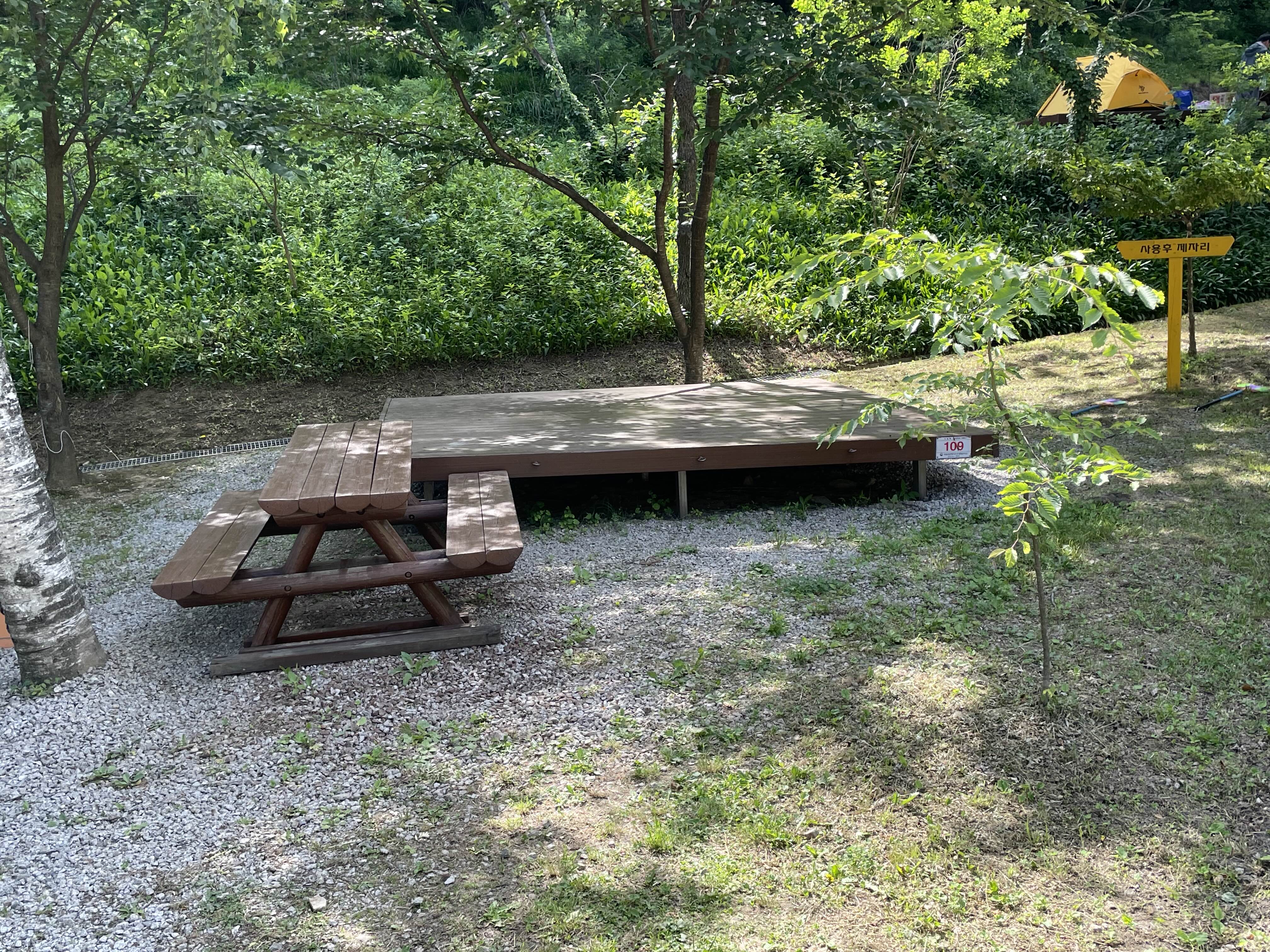 아래 사진이 바로 기본적으로 제공되는 캠핑사이트입니다. 데크 크기는 3.6mX3.6m입니다. 데크 하나와 나무로 만든 테이블이 기본으로 설치되어 있습니다. 지금보시는 사이트는 109번 사이트입니다.