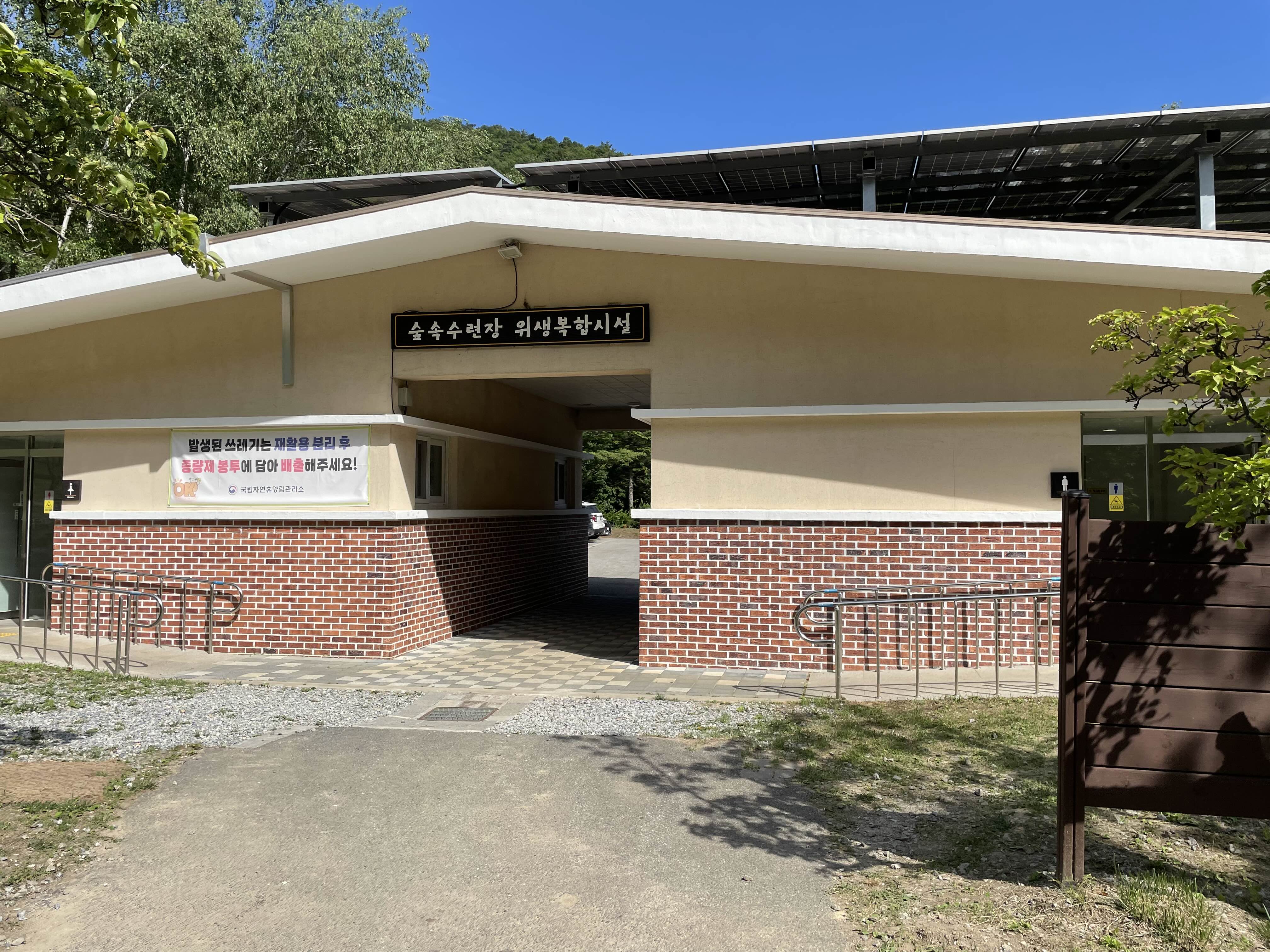 국립대관령 자연휴양림 야영장에는 어떤 시설이 있는지 한번 살펴보겠습니다. 아래 사진이 바로 모든 시설이 총 망라해있는 복합위생시설입니다.