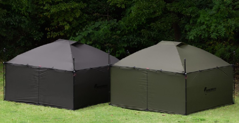 데크와 지면의 간격이 꽤 떨어져 있는 것을 볼 수 있습니다. 홈페이지의 설명을 보시면 13제곱미터라고 써있는 것을 보실 수 있는데 어느정도 크기인지 가늠이 잘 안되실 수도 있습니다. 쉽게 설명 드리자면 요새 캠핑장에서 자주보이는 아래와 같은 백컨트리 320 쉘터가 조금 남기는 하지만 딱 알맞게 들어는 정도입니다.