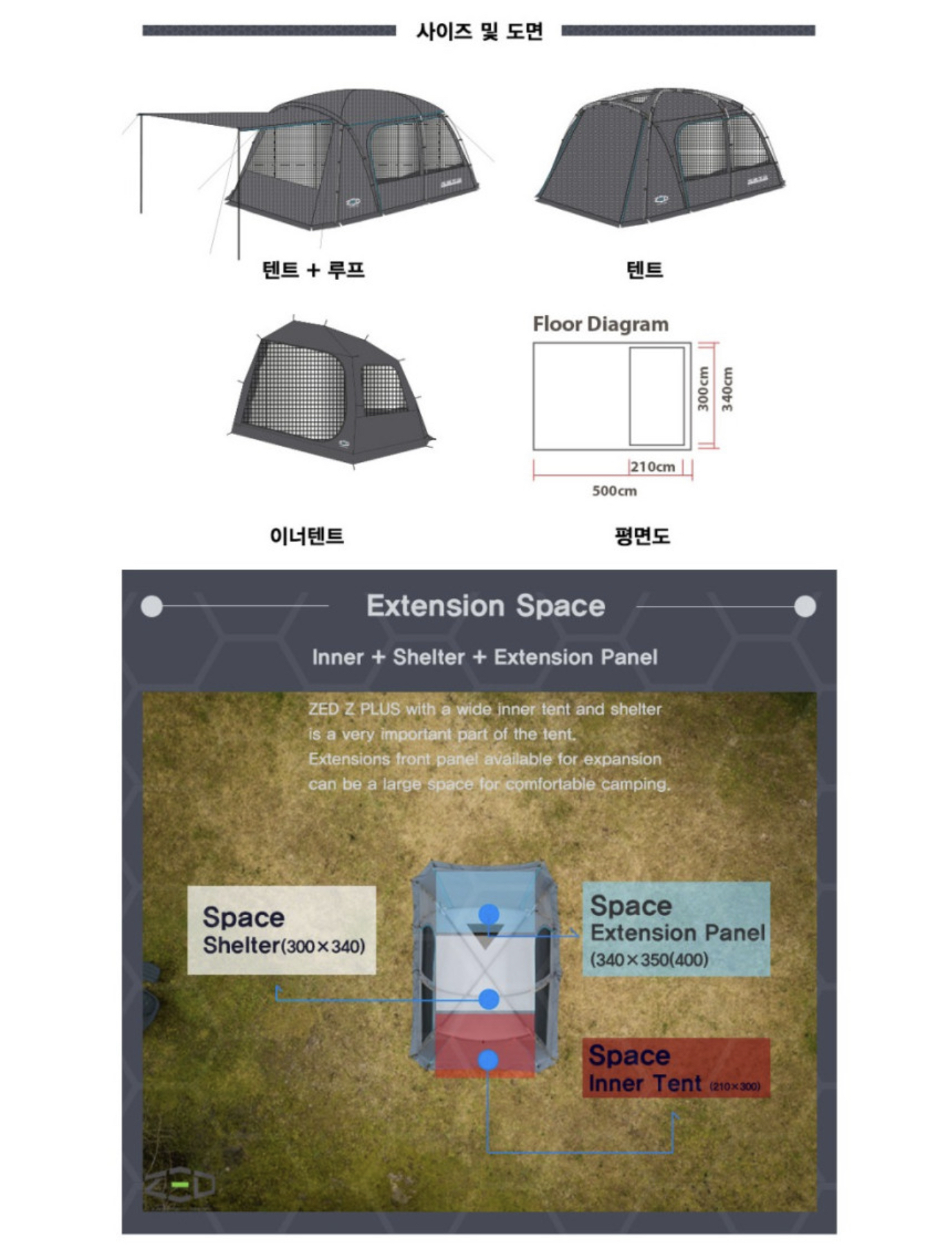 저는 이번에 120번 데크를 잡았습니다. 알고 잡은 건 아니고 남은 자리가 있길래 잡은 거였는데 운좋게 정말 좋은 자리였습니다. 왜냐면 제가 가지고 간 텐트가 ZED Z+ 텐트이기 때문이죠. 제드 Z+ 텐트는 전실을 가지고 있는 6인용 텐트입니다. 사이즈는 아래를 참고해 주세요.