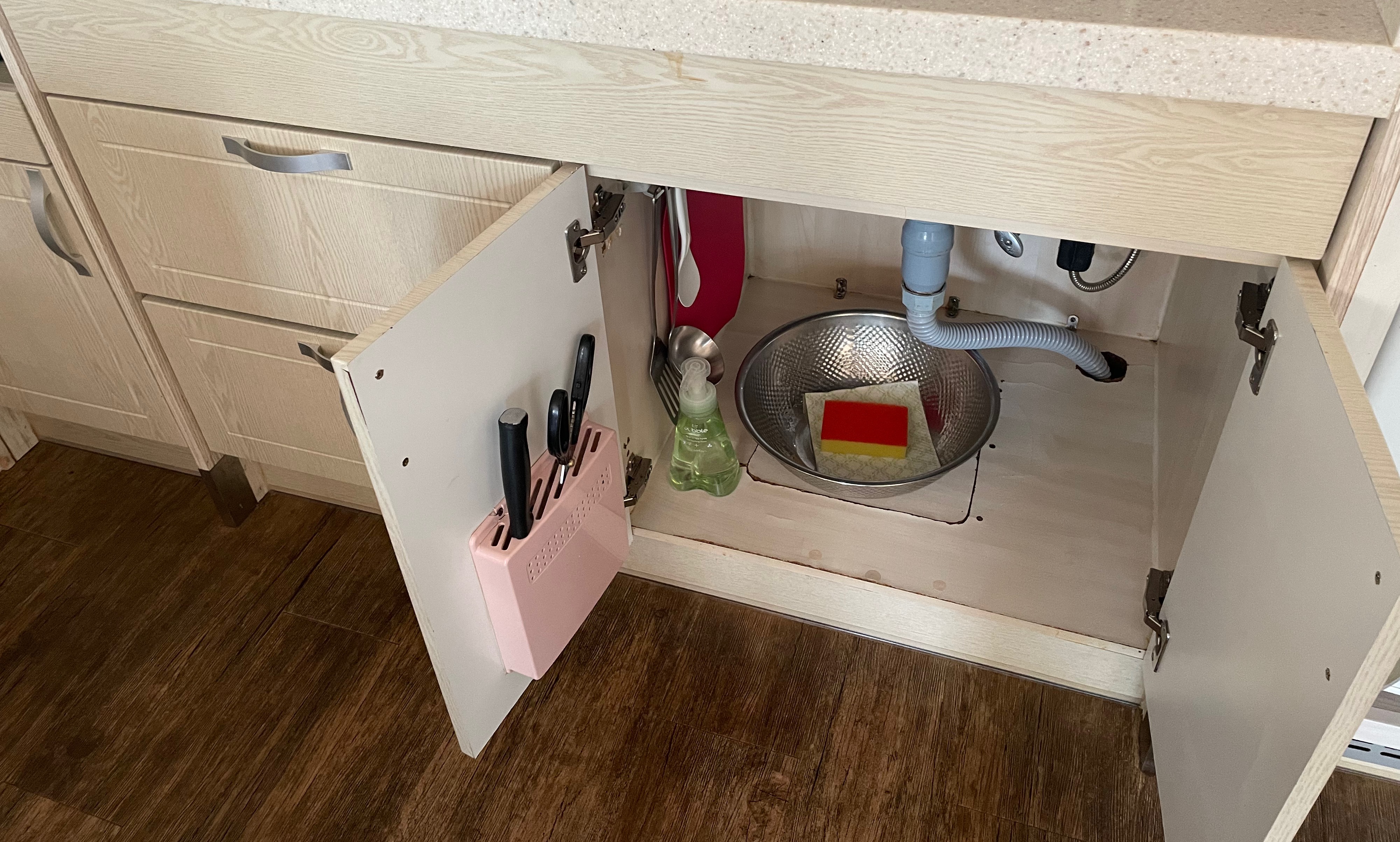 싱크대 서랍을 열어보면 칼 도마, 설거지 용품 등이 있는 걸 볼 수 있습니다.
