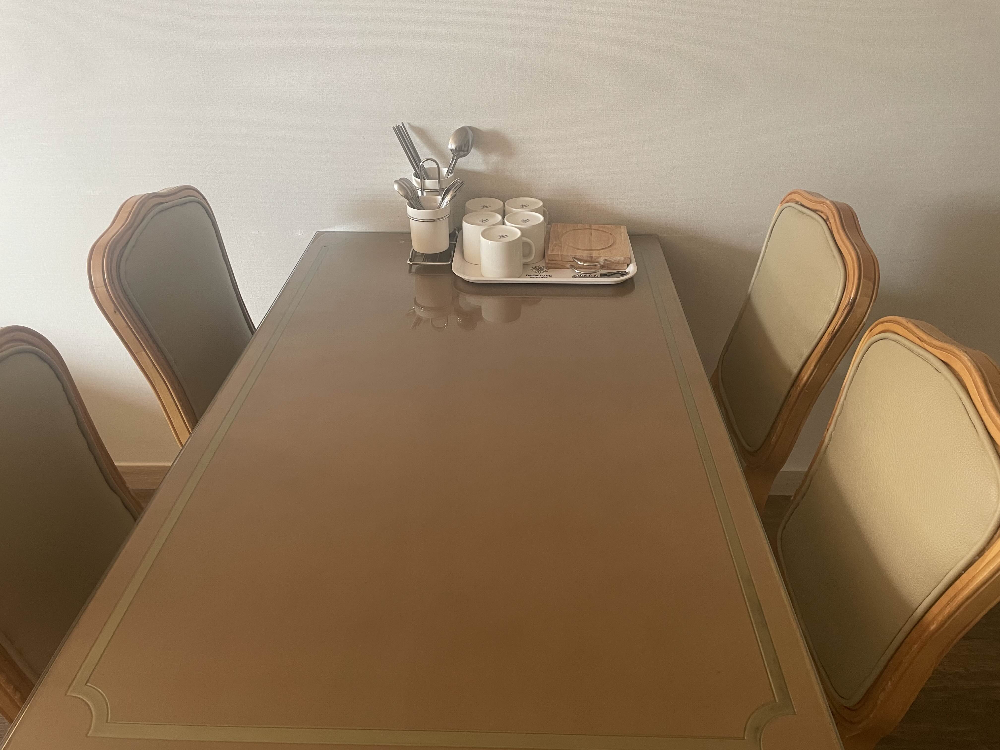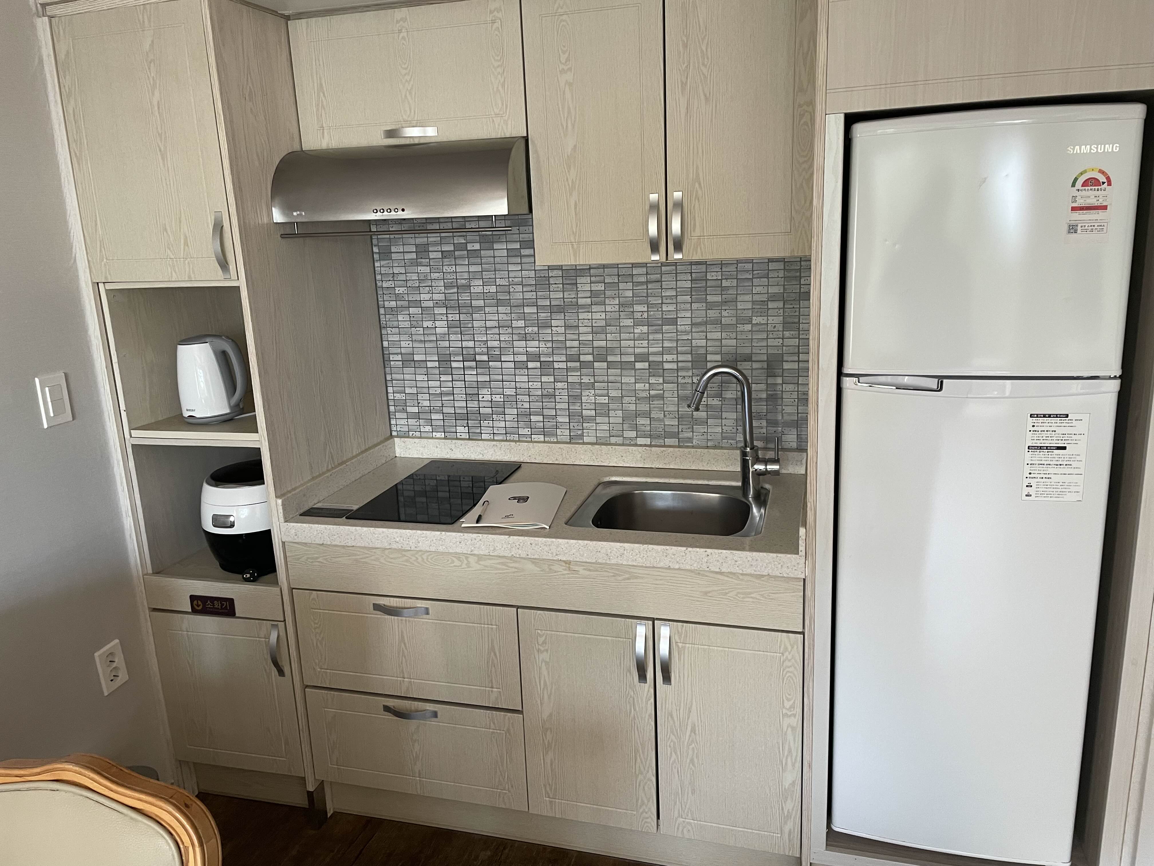 객실의 구조는 오래된 콘도에서 흔히 볼 수 있는 마스터룸+게스트룸 구조입니다. 거실에는 식탁을 구분으로 주방과 분리되어 있구요. 주방에는 밥솥, 포트, 식기 등을 갖추고 있습니다.
