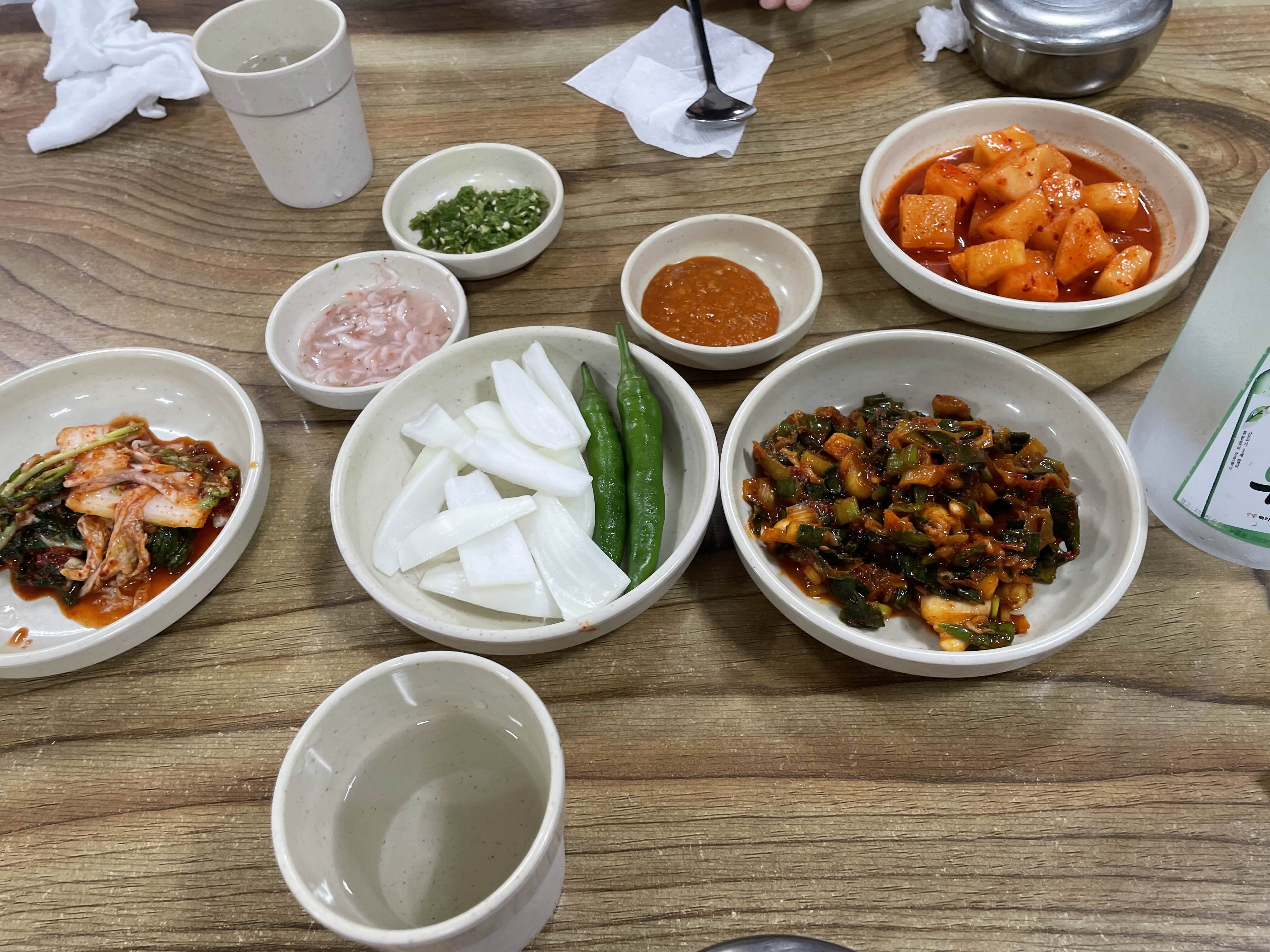 번호표를 뽑아들고 나서 번호를 호명하는 직원의 말에 귀를 기울이다보니 금방 들어갈 시간이 되었습니다. 회전율도 좋고 금방 자리가 납니다. 종업원들이 힘차게 자리를 치우기 때문에 그렇게 오래 기다리지는 않습니다. 들어가면 바로 반찬이 깔리는데 아래 깔리는 것을 보면 그리 특이하지 않습니다.